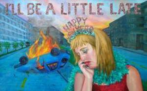 Lyles’ 12 new colorful oils on canvas with Byzantine inspired glitter applied for textual narrative are from her “12 Steps” series. As a recovering alcoholic/addict with over 23 years clean and sober, Lyles combines humor and pathos to the theme, while cleverly removing some of the stigma. Interpretations of Step 1 of the 12 Step recovery program are abundant with a painting of a woman waking up next to a stranger with bold text in pink, puffy glitter that reads, ”WHO ARE YOU?,” or a scene of a woman on a cell phone with a rolled car behind her reads, “I’LL BE A LITTLE LATE…”. Her fantastical realism and bold glitter text brings a light hearted quality to the illusory beauty, drama and escape promised – but rarely delivered – by drugs and alcohol.