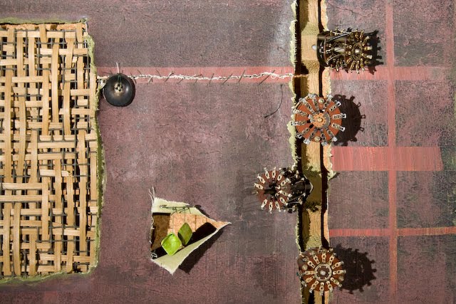 I paint to create backdrops – to create depth in the flat plane, and to challenge what art is. My undisciplined eyes rip, score, sew and drill into a canvas that is not sacred. The paintings are vessels – holding discarded and repurposed objects and transforming their existence to a life of beauty and admiration.