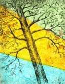Last chance to see Tatyana Brown’s amazing linocut, drypoint, and chine-colle prints. Shown is “Four Seasons”.