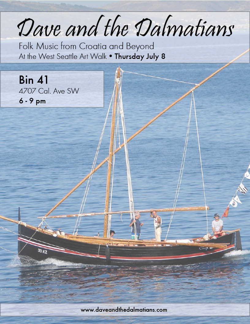 And…drum roll please…to make things even more festive, we will have two different, local musical groups joining us at the bin for the evening. Dave and the Dalmatians, a group of eight guys singing songs from the Croatian coast and beyond will be greeting you outside. Later in the evening, we will again be joined by Reddog, the three piece acoustical string band that shared their musical artistry during the last art walk. Visit their websites to learn more about each band at http://www.daveandthedalmatians.com and http://www.reddogseattle.com