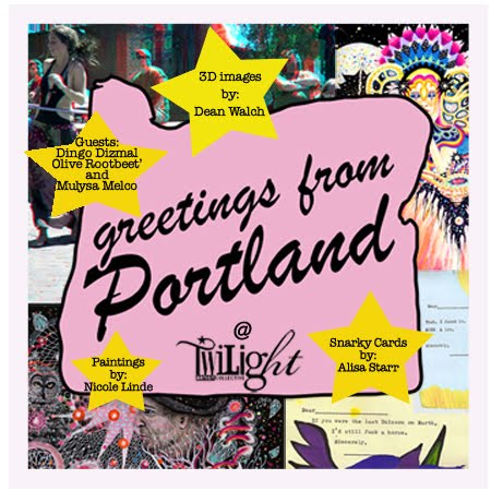 Featuring: 3-D images by Dean Walch, Snarky cards by Alisa Starr and Paintings by Nicole Linde. Guest artists Mulysa Melco, Dingo Dizmal and Olive Rootbeer.