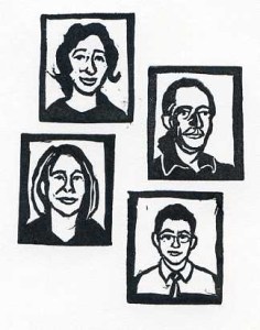 I am from Seattle. I was born in 1971, and began painting in high school. At Cornish College of the Arts I learned printmaking and have been making prints ever since. Early on, I made woodblock prints, but began experimenting making small prints out of erasers and a rubber-like material called Safety-Cut. I appreciate the simplicity and speed with which I can create images. The imagery in the prints comes from drawings from life, photographs, and advertisements, with inspiration from artists such as Heckel, Beckmann, Munakata, Maillol, Matsubara, Hiratsuka, Bonnard, and Edenshaw. The prints are after a sense of liveliness and mystery in the shadows and unexpected patterns. I enjoy the interplay of light and dark.