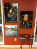 Ruth Moen brings to her acrylic folk art the influences of her extensive world travels, passion for innovation and delight in things untamed. Using stripes, splashes, swirls and flourishes of luscious hues, she transforms otherwise simple chairs, bowls and plates so that they appear to have just floated in from an enchanted wonderland. Ruth takes wonderful photos during her travels and transforms them into three dimensional wall sculptures. The photo gets lost in that thin line between reality and fantasies, giving each piece an almost ethereal quality.