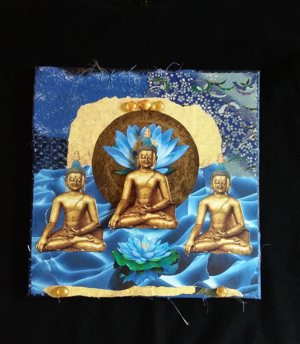 Inner Alchemy welcomes Jen Maurice as our November Artist! Jen Maurice is an internationally known multi-media collage artist. Her interest in collage began as a teenager when her bedroom walls were plastered with butcher paper covered in images and found objects that had caught her attention and her heart. That drive to create was put on the backburner for many years as Jen worked and raised a family on her own. As she neared retirement and life’s demands became fewer, that creative fire was rekindled. Although not religious, Jen feels an affinity for religious and spiritual icons. The creation process of collage using these images has become part of her spiritual practice. Each collage begins with a gentle nudge of an idea. That idea is then allowed to express itself through Jen on to canvas. The process is organic, fluid and intuitive. A form of deep meditation. It can take many days for a piece to be completed as Jen waits for guidance from her muse indicating the next step in the creative dance.