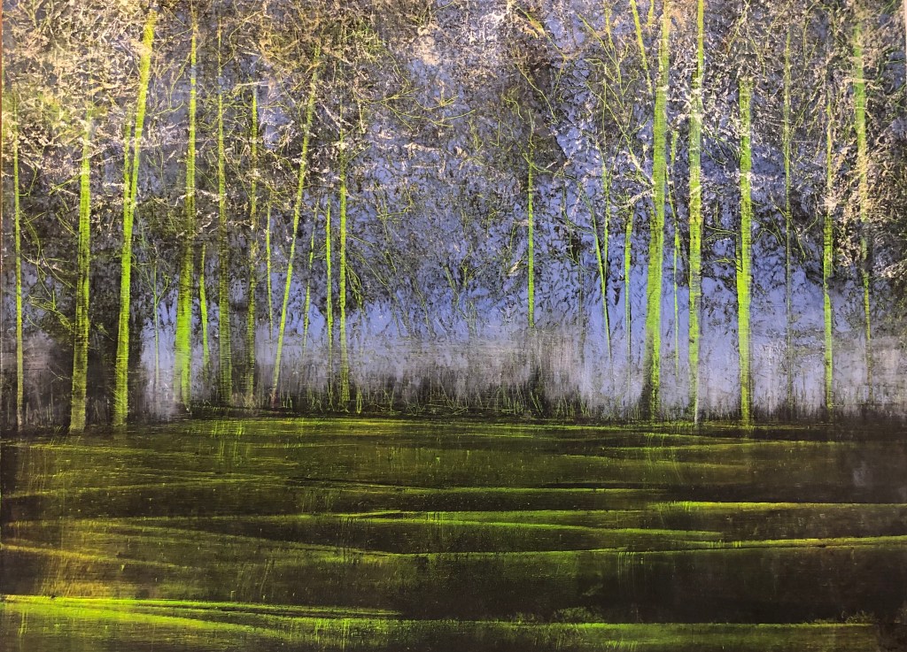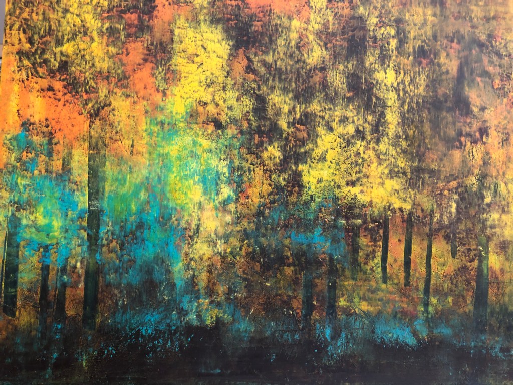 Ellen Zrimsek is a West Seattle artist currently exploring oil+cold wax and mixed media to capture her fascination with trees and forests. Trees with their natural intelligence are communicating with each other, creating precious oxygen and habitat, and decorating our world with their beauty. I want to help protect these friends and I will be donating 50% of my profits from this show to the Nature Conservancy in their honor.