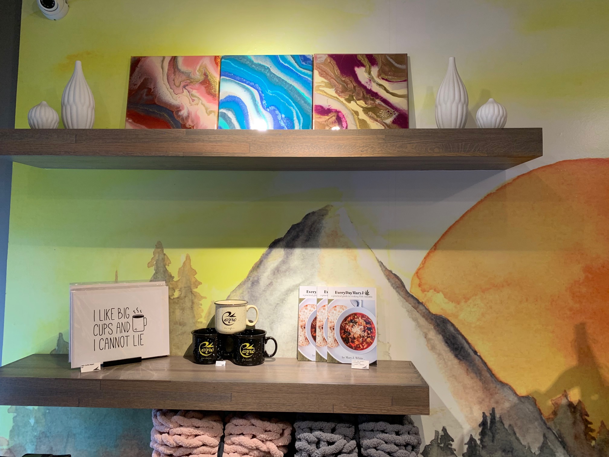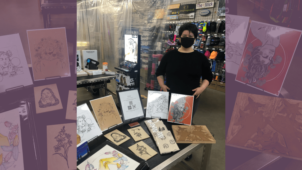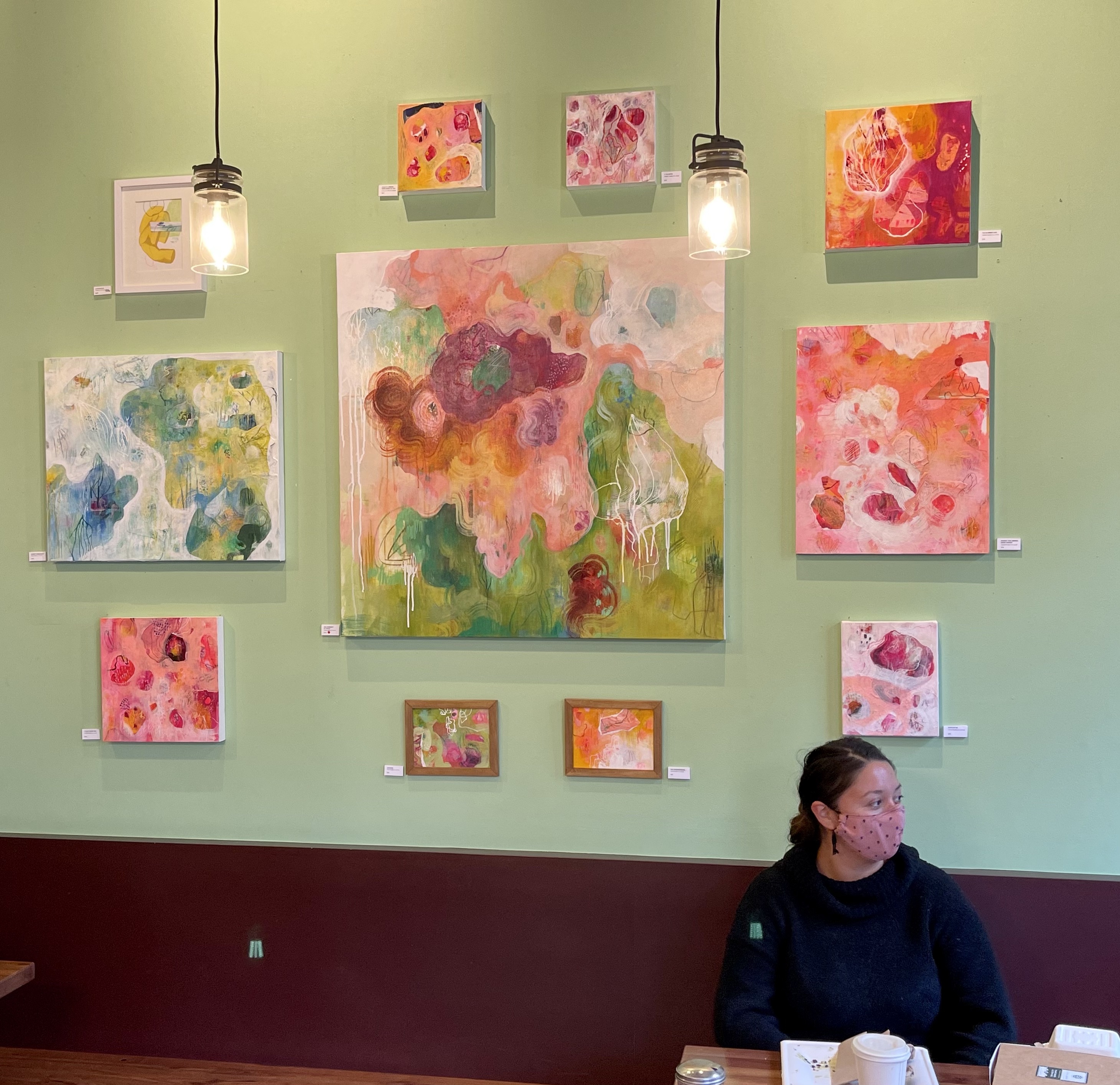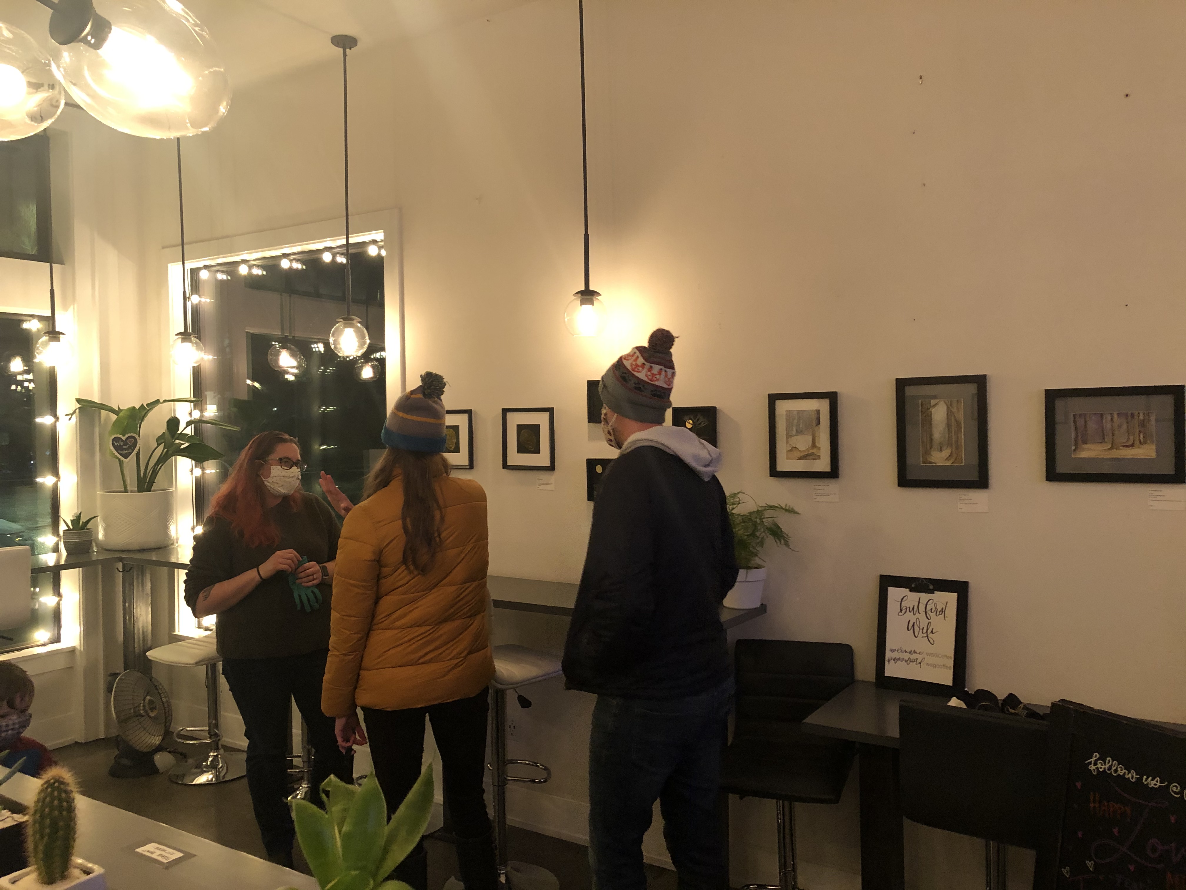 Love was in the air during the Feb 11 {HE}Art Walk with a number of (masked) in-person artist receptions. Something about the snow seemed to bring Art Lovers out to stroll and appreciate the work on display. If you weren’t able to come out, catch our livestream videos on Facebook and Instagram! Between the businesses and artists – and us – social media for the event burned with the flames of love. Let’s keep it up, people! It really was feeling like an event of yore.