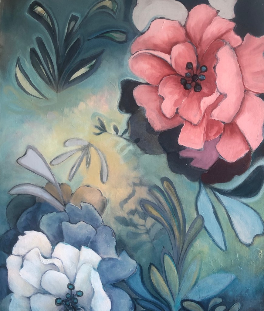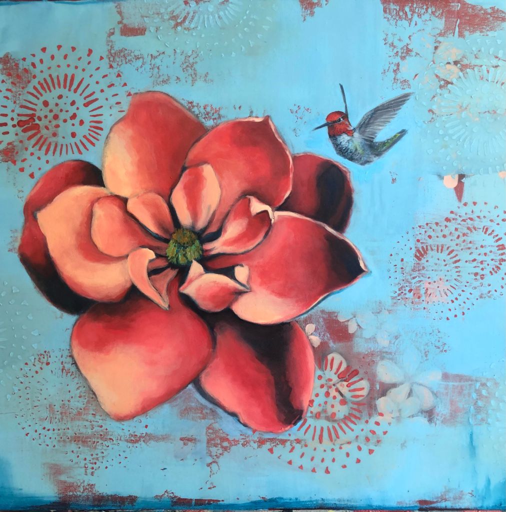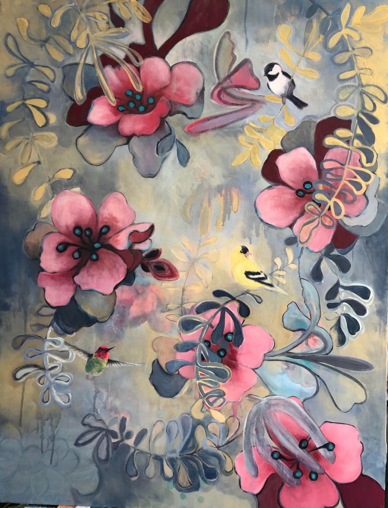 The flower generally comes in pinks, lavender and whites but I have been exploring the same shapes and planes with bold or just unexpected colors to hint of indulgent daydreams and whimsy. I incorporate my birds to frolic among my fairy tale inspired abstract flora. I include hints to natures indulgences in our natural eco systems and hope to remind my viewers to not take any of natures gifts for granted. Learn more on her website.