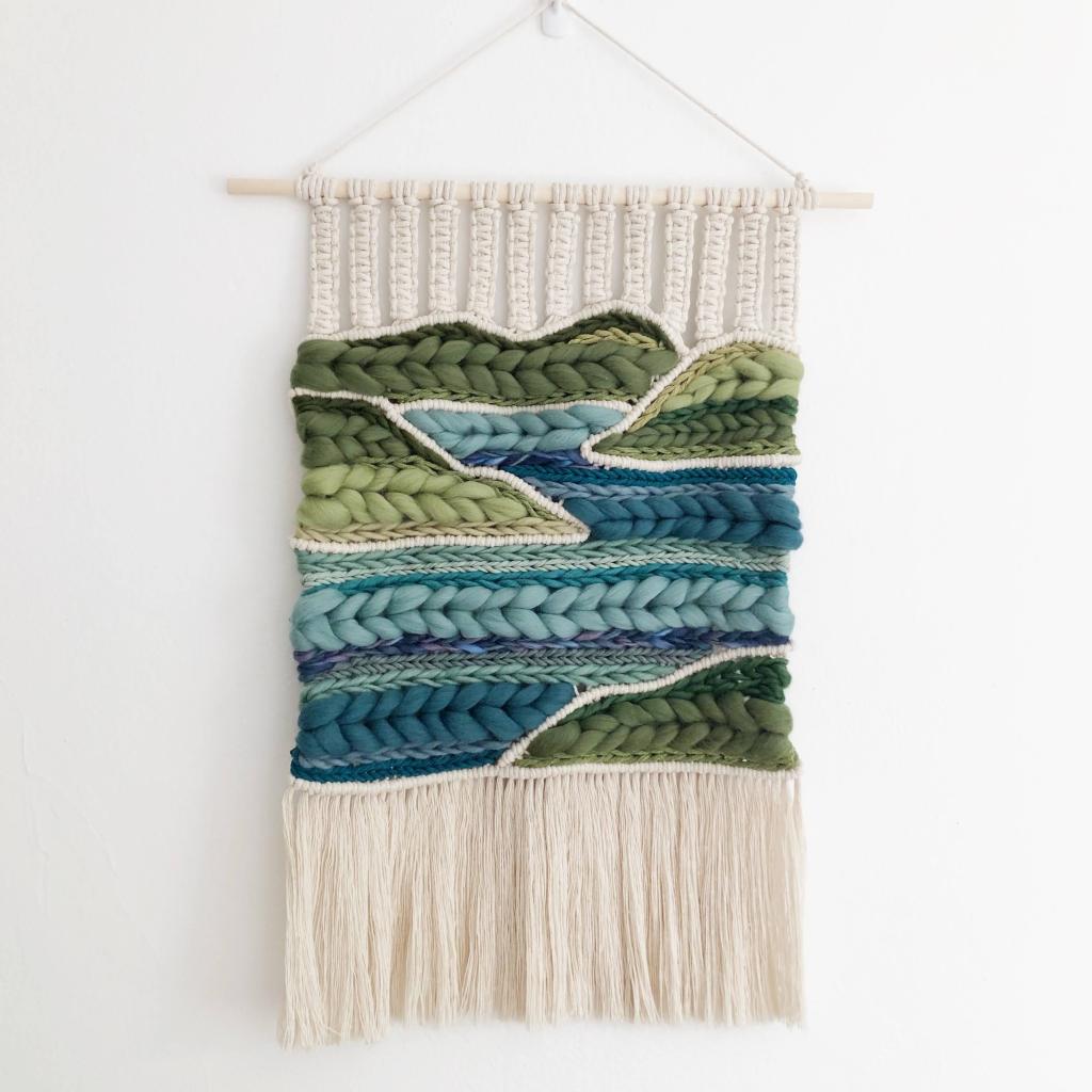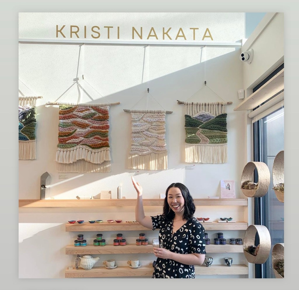 Kristi Nakata is a Yonsei (fourth generation) Japanese American fiber artist born and raised in the Seattle area, on Duwamish and Coast Salish land. Kristi creates macraweave wall hangings combining techniques of macrame and weaving. Inspired by the beauty of the Pacific Northwest, this collection is a series of mountainscapes and abstract interpretations of the colors of our region.