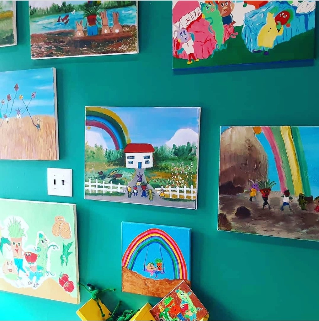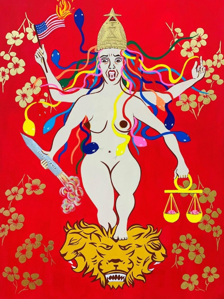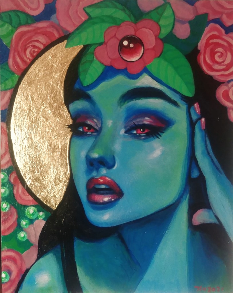Lady Elliot’s artistic style has developed from a mixture of influences from her personal evolution as well as fondness for the life and excitement of the night. When she first began to paint black backgrounds it was because she felt that the blackness has so much more potential and mystery to it than any other colour. White backgrounds always felt like an empty container void of mystery whereas the darkness spoke to her, as if all the vivacious characters hiding in the blackness were inviting her to come and discover them. Lady Elliot has always been a night owl and first began to pair black backgrounds with brightly colored characters and creatures as a means to connect with her child-self who would always insist on staying up late to create and play with bizarrely colored creatures. May we all stay connected with our inner child!