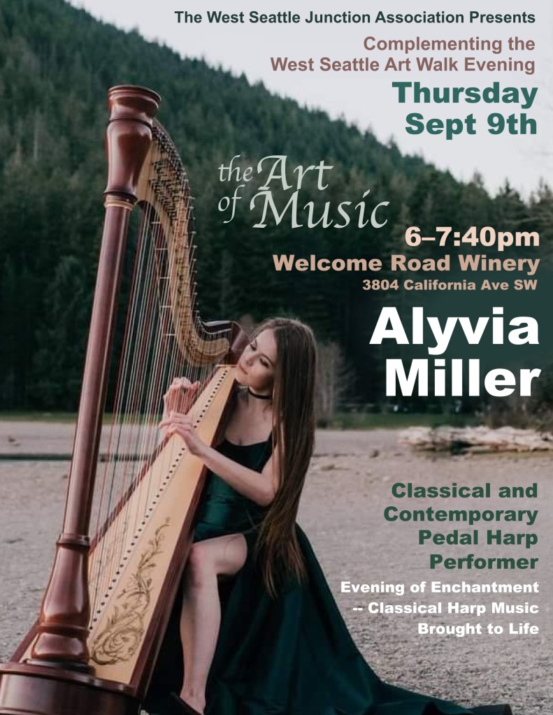 - Enjoy the music of harpist Alyvia Miller at the Welcome Road Winery in Admiral Junction, with an “Art Walk Special” wine tasting! Click here for Alyvia’s flyer.