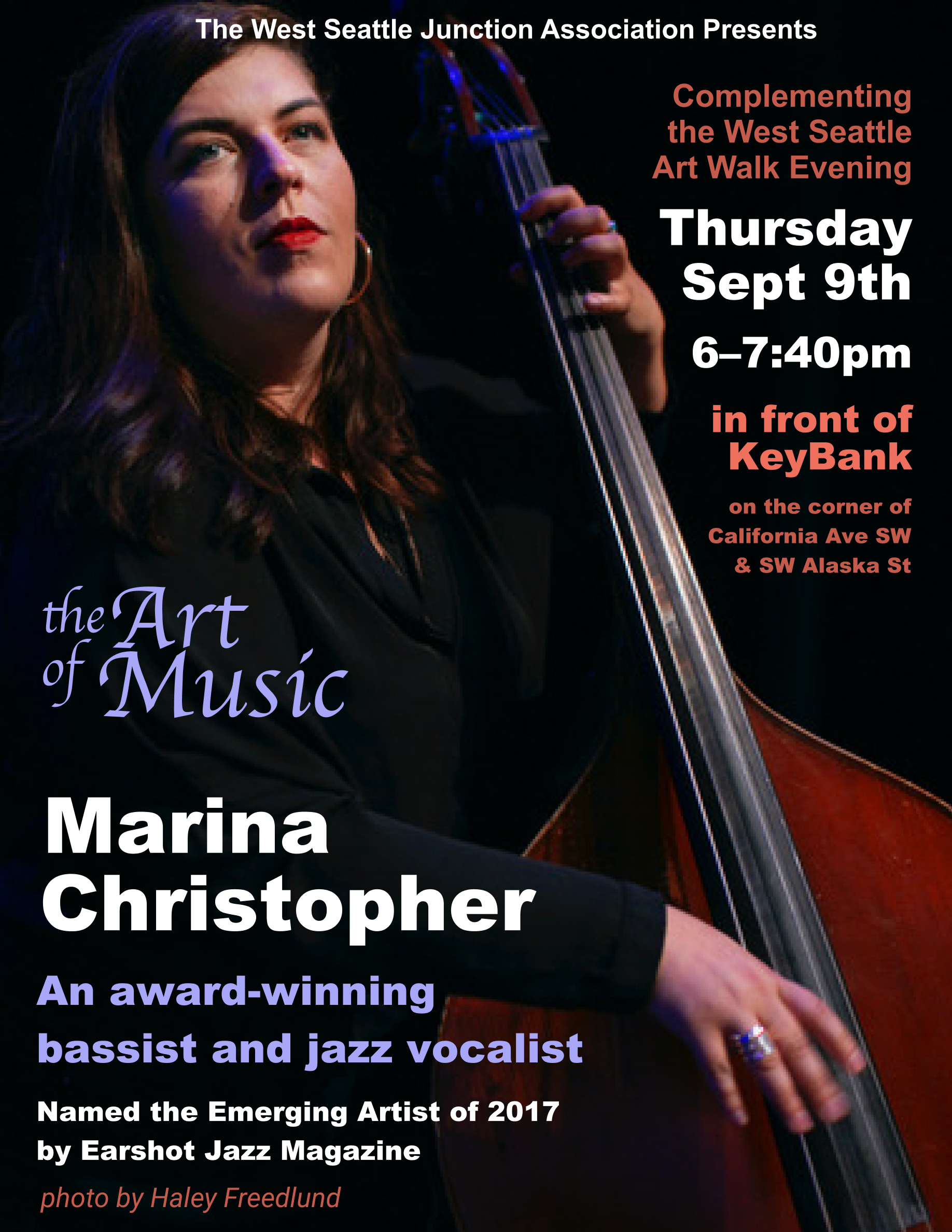 - Enhance your stroll with award-winning bassist and jazz vocalist Marina Christopher at the KeyBank Plaza in Alaska Junction. Click here for Marina’s Flyer.