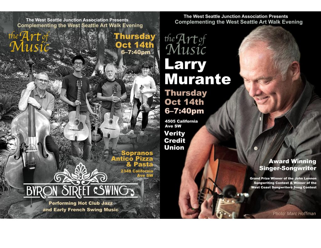 The October 14 West Seattle Art Walk again features the Art of Music – now with indoor events both in Admiral and the Alaska Junction! (Please follow all mask and social distancing requirements)