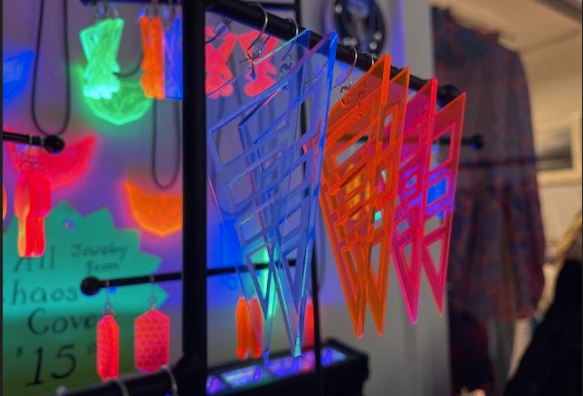 Another talented artist sharing their creations at the Art Walk was Katelyn Williams, founder of Chaos Coven, a shop with affordable, handmade, cyberpunk, laser cut jewelry. Katelyn started making jewelry at a military base in Arizona.