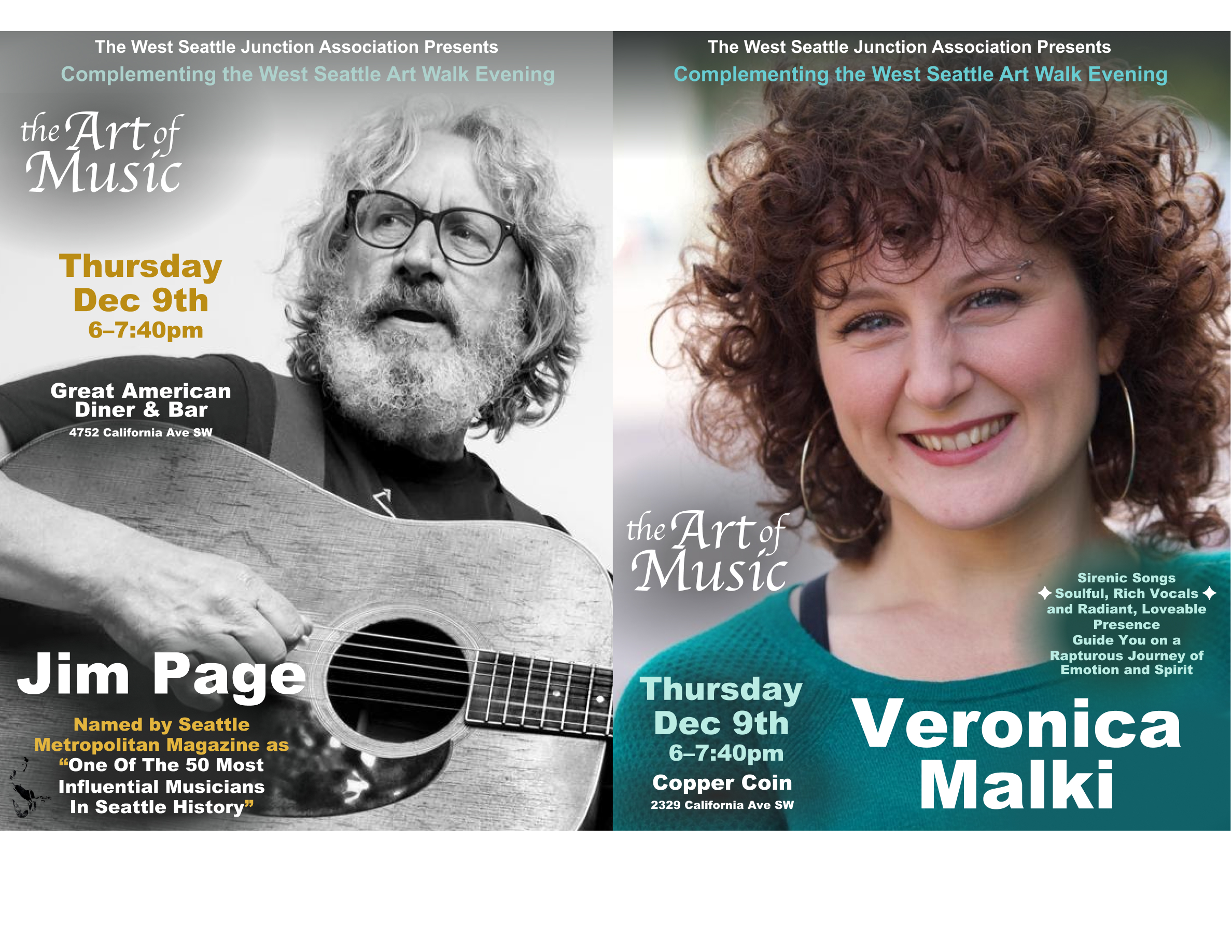 - Art Walk Food & Drink Specials abound at Great American Diner & Bar, and this month, you can enjoy them with a stirring performance by legendary folksinger Jim Page. Named by Seattle Metropolitan Magazine as “One Of The 50 Most Influential Musicians In Seattle History,” Jim shares his “searing, compassionate lyrics… for both the mind and soul.” Click here for Jim Page’s flyer.