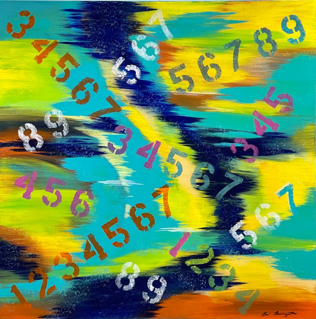 Featuring guest artist Chris Baumgarten’s bright and lively paintings. Using numbers as repeating literal patterns over abstracted images.