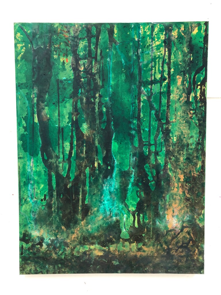 Deb McCarroll’s bold work embodies the Northwest’s regional culture. Patterns are created with Seattle’s ubiquitous falling rain. Paper is integrated into wet paint and then set on fire. Metal leaf is frequently woven into scenes and selectively oxidized with acid to add patinas in glittering greens and browns. Local flora and fauna are painted in startling realism and then pared with raw abstract practices.