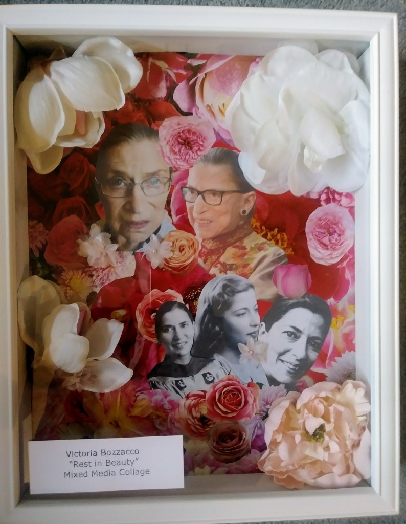 I am a collage artist. I love working with images, objects, colors, and textures to create something pleasing to the eye and maybe even tell a story. I am available to work with you to create a memory of a beloved someone. My collage “Rest in Beauty” honoring Ruth Bader Ginsberg is an example of what can be done using collage to create a memorial piece. You may reach me at vobozzacco@gmail.com.