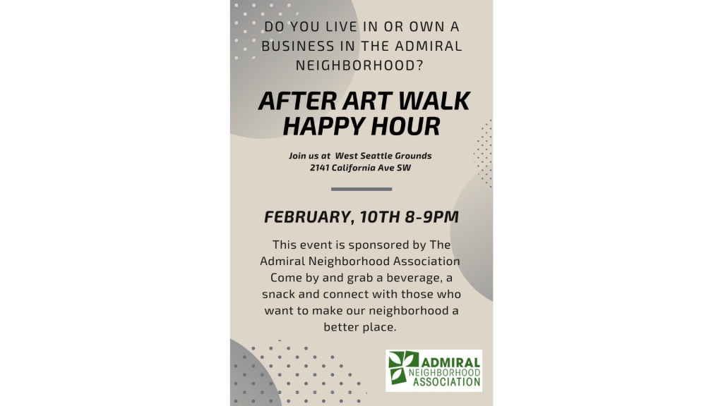 As a bonus, the Admiral Neighborhood Association has scheduled an After Art Walk Happy Hour the same night as Muse Fest, beginning at 8 pm at West Seattle Grounds, one of the Muse Fest venues. Join in to connect with neighbors and local businesses!