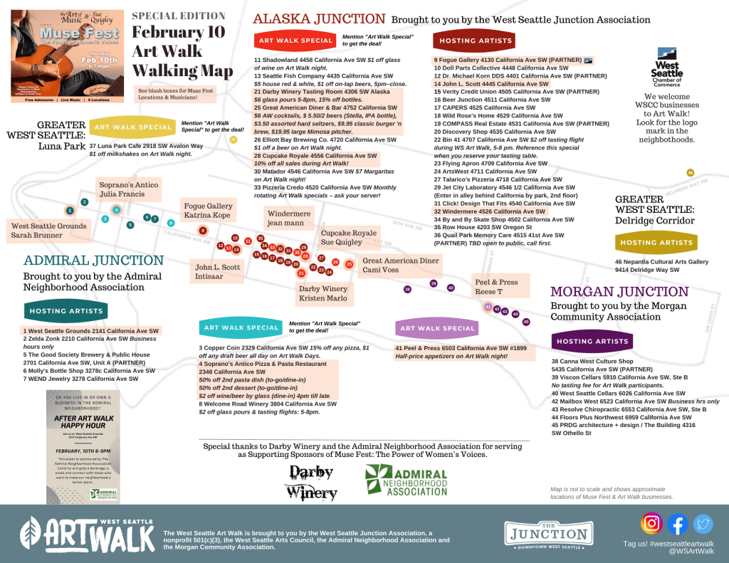 Make plans now to attend a special event, free of charge: Muse Fest: The Power of Women’s Voices will be part of the next Second Thursday Art Walk on February 10! This musical extravaganza is presented by The Art of Music and local musician Sue Quigley and will feature musicians performing at 9 businesses within the Admiral Junction/Greater Admiral Neighborhood, Alaska Junction and Morgan Junction.