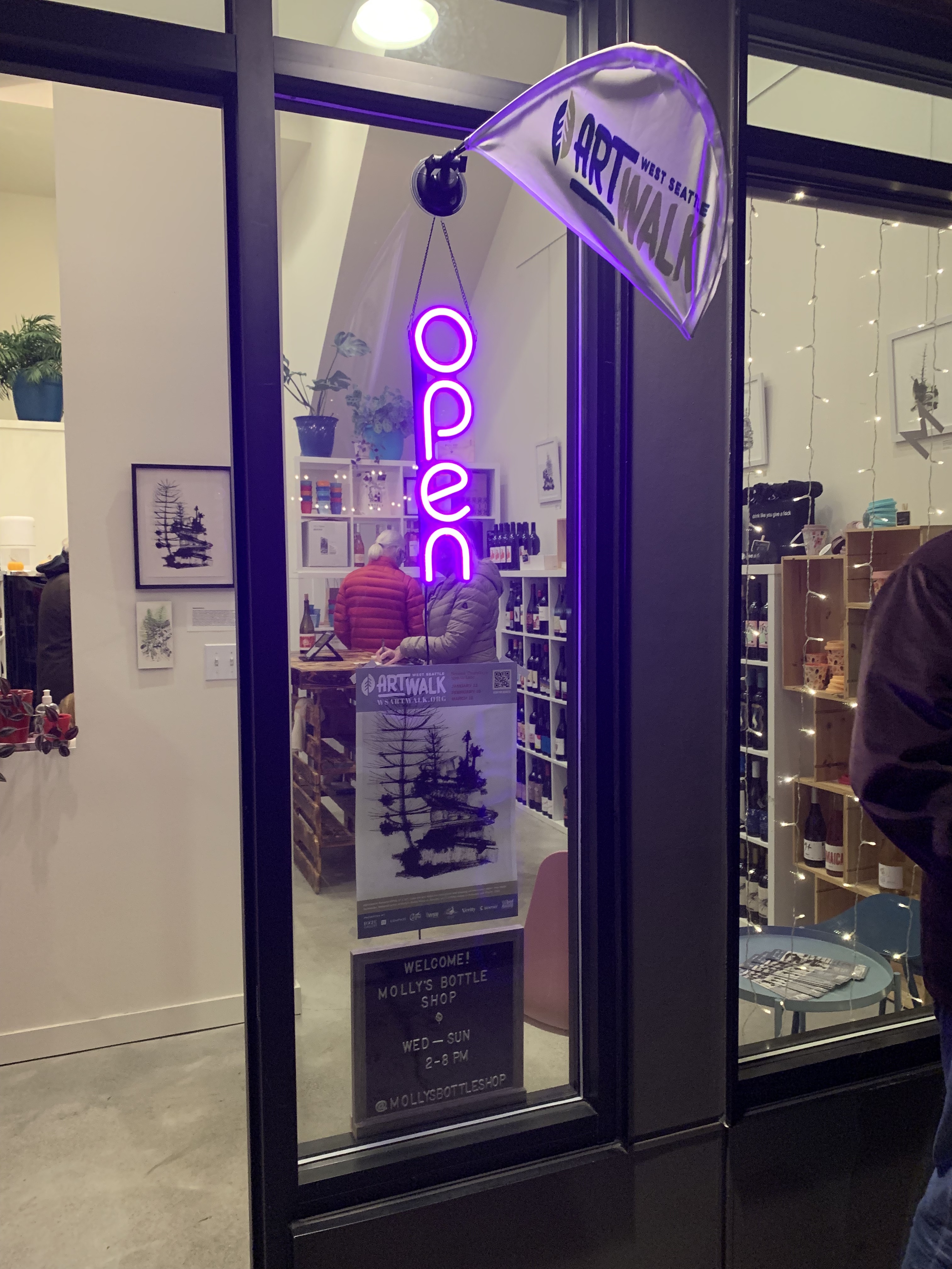 For a month still shadowed in uncertainty and concern, we were grateful for all the neighbors who came out, seeking some respite and, dare we say it, a jab of joy. Many businesses introduced us to new artists, and there were pockets of parties from Admiral down to Morgan. Art lovers as well as wine tasters from Molly’s Bottle Shop bopped to the beat of E. Pruitt’s bass guitar outside of WEND Space, thanks to their partnership with the City of Seattle program Shop to the Beat. Bright colors cut through the winter grays at businesses like Row House, Beer Junction, Fogue Gallery, John L. Scott, Viscon Cellars and Discovery Shop – even the skateboard art and prints at By and By, our newest Alaska Junction and Art Walk business. So many different kinds of expression were on display, from collage at Zelda Zonk and Capers, to mixed media, digital painting, photography, watercolor and jewelry.