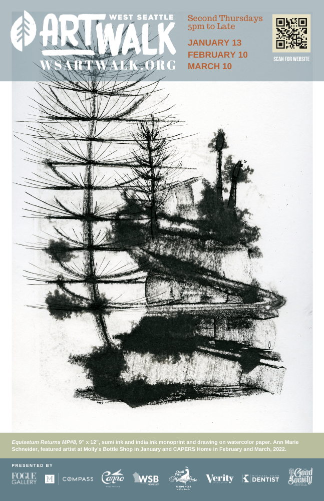 If selected, your artwork will be featured in our social media, on printed posters displayed around West Seattle in participating businesses, and on walking maps available at participating businesses. We also strive to have the featured artist show their art all three months at businesses around West Seattle. This is a great opportunity to have your work displayed and promoted in our community, like “Equisetum Returns MP#8,” by Ann Marie Schneider!