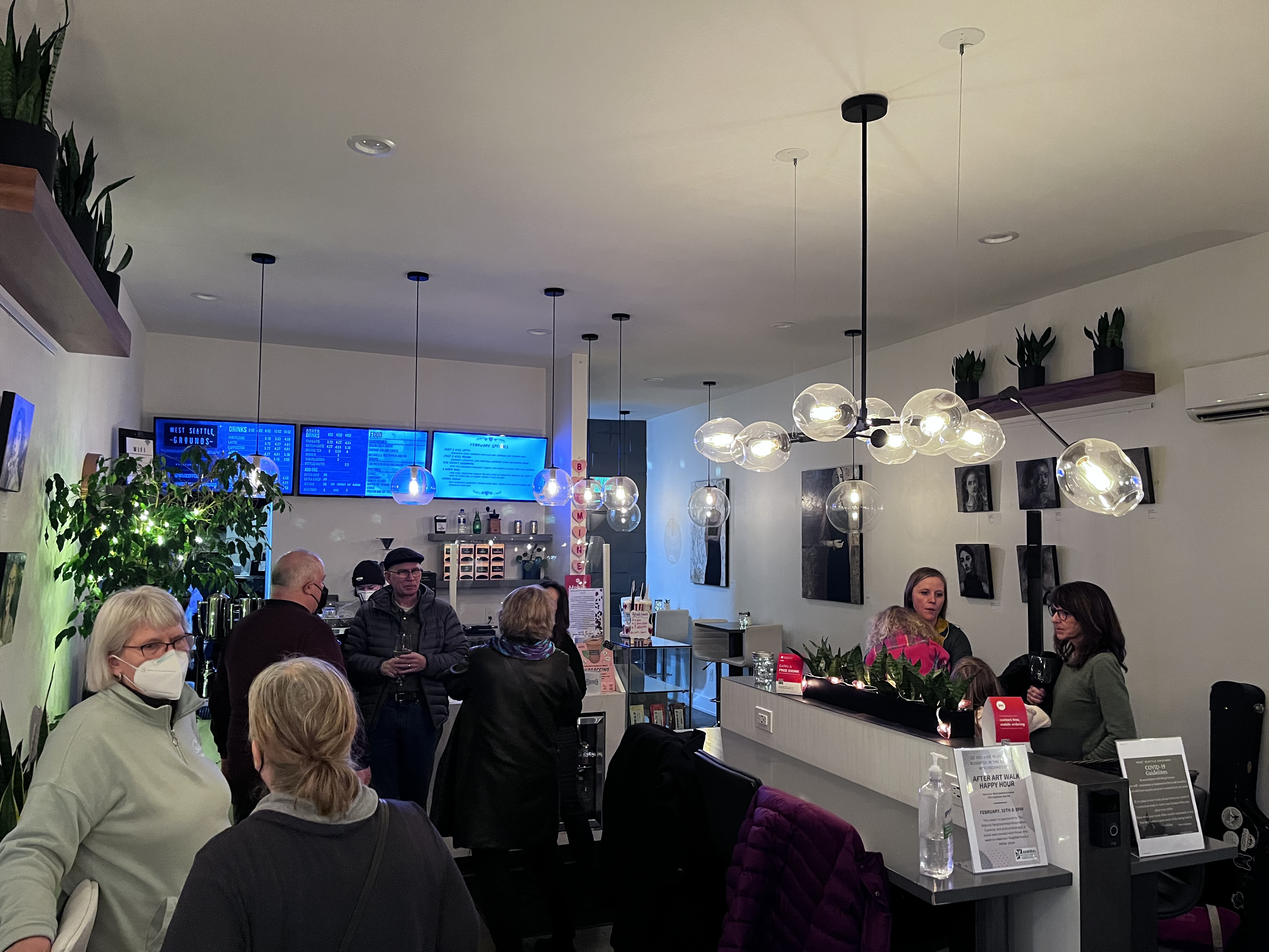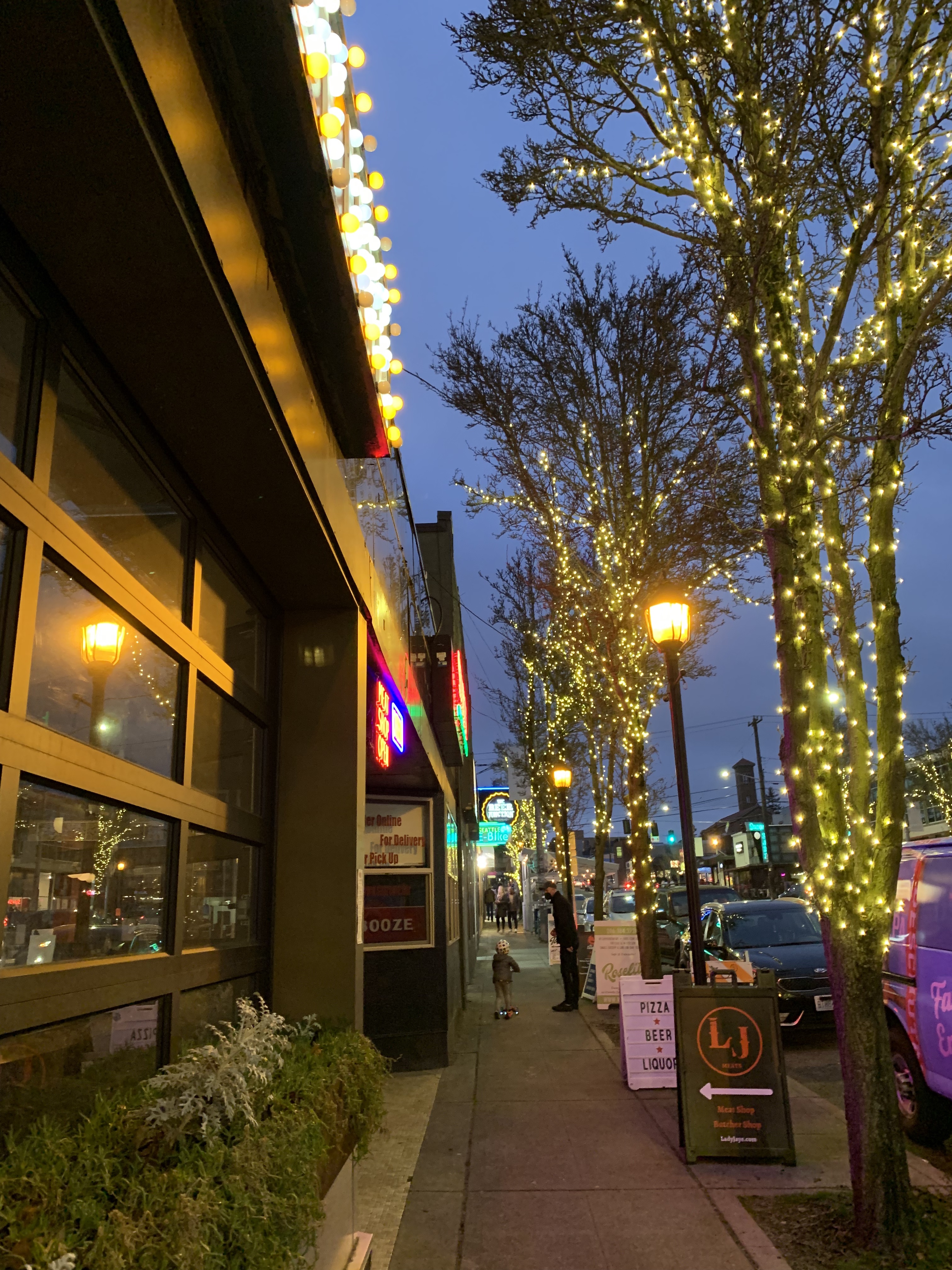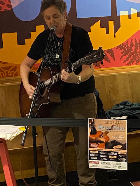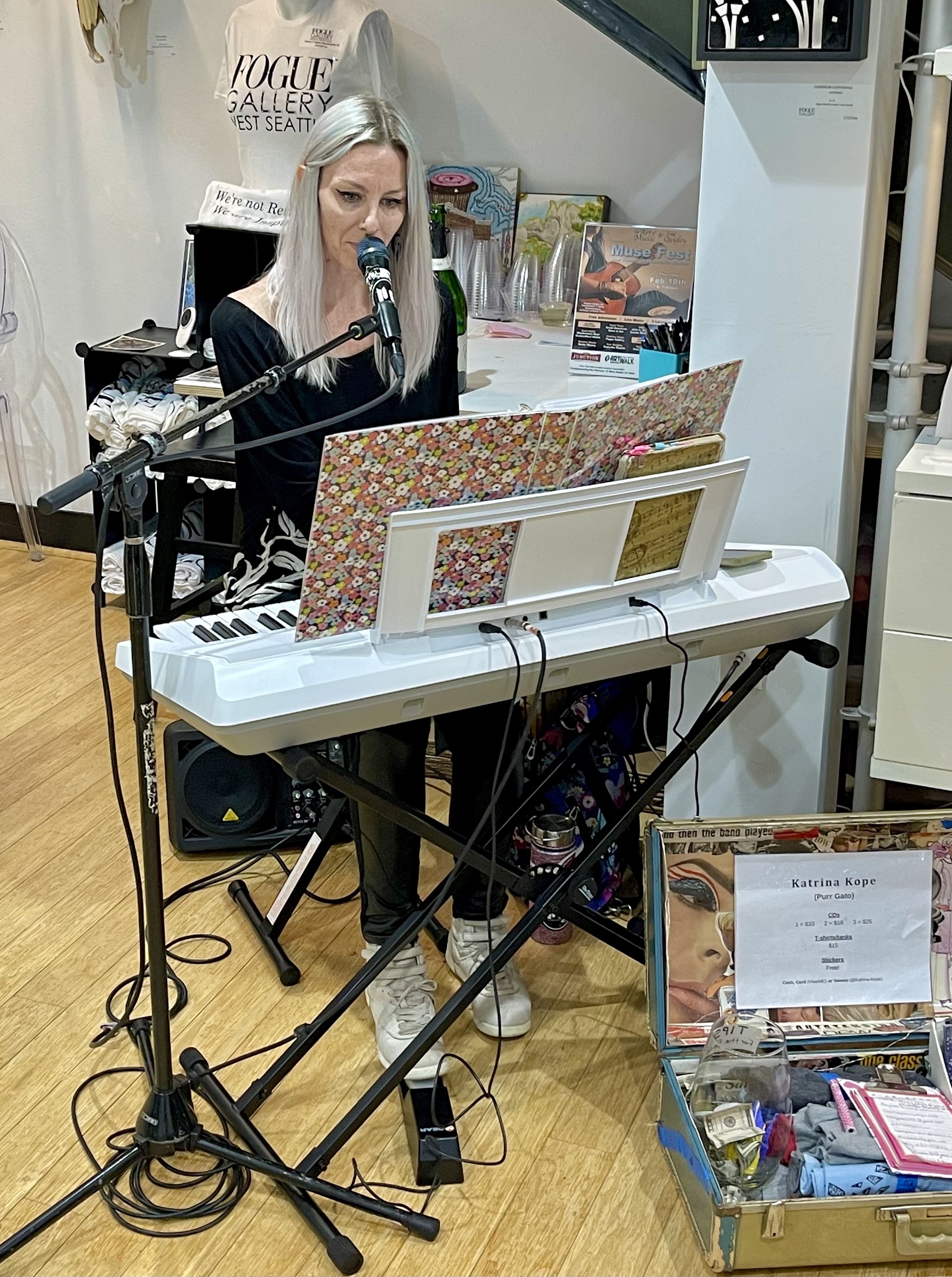 We felt the sound waves of good vibes all around the Art exhibits in West Seattle, thanks to the Muse Fest musicians and hosting businesses! What a special evening brought to us by the incredible efforts of local musician Sue Quigley and The Art of Music volunteer John Redenbaugh. Their labors of love meant a very rich Art Walk experience last night. Did you also catch the music at WEND Space, thanks to their partnership with the City of Seattle program Shop to the Beat? So much wonderful sound, in addition to all the varied and beautiful art from Admiral through to Morgan Junctions! Graced by the magical new twinkling lights on the trees lining California Avenue.