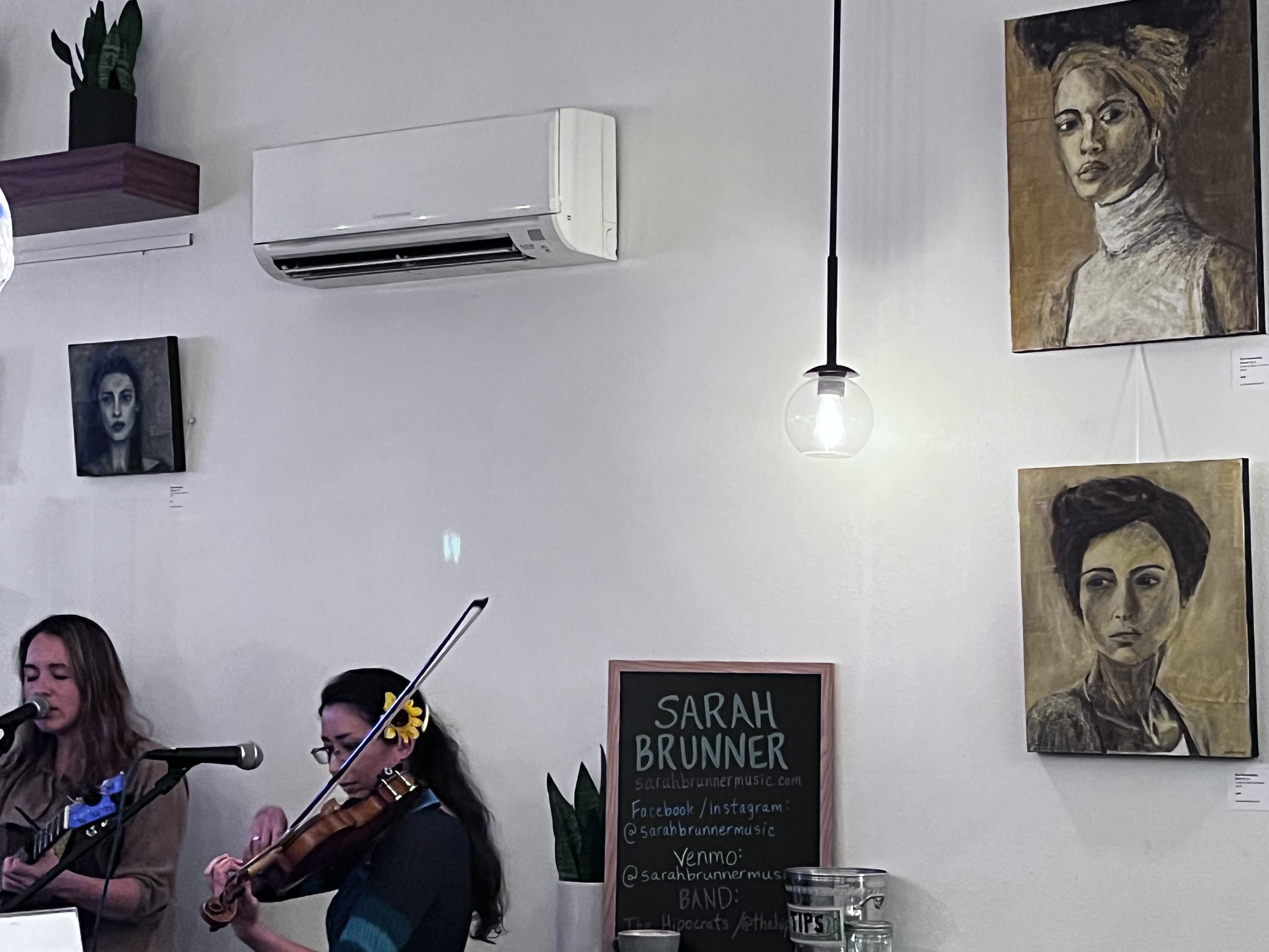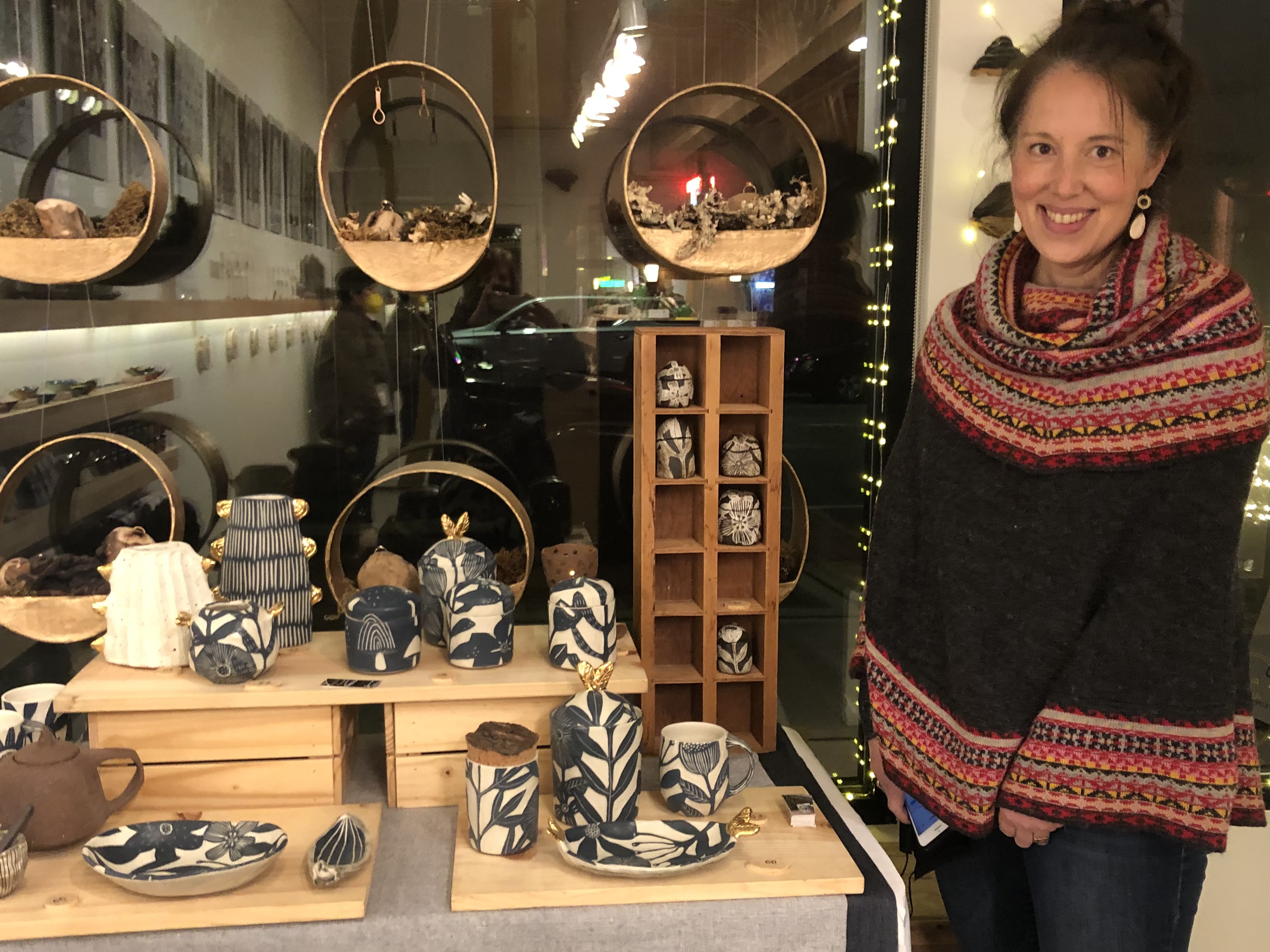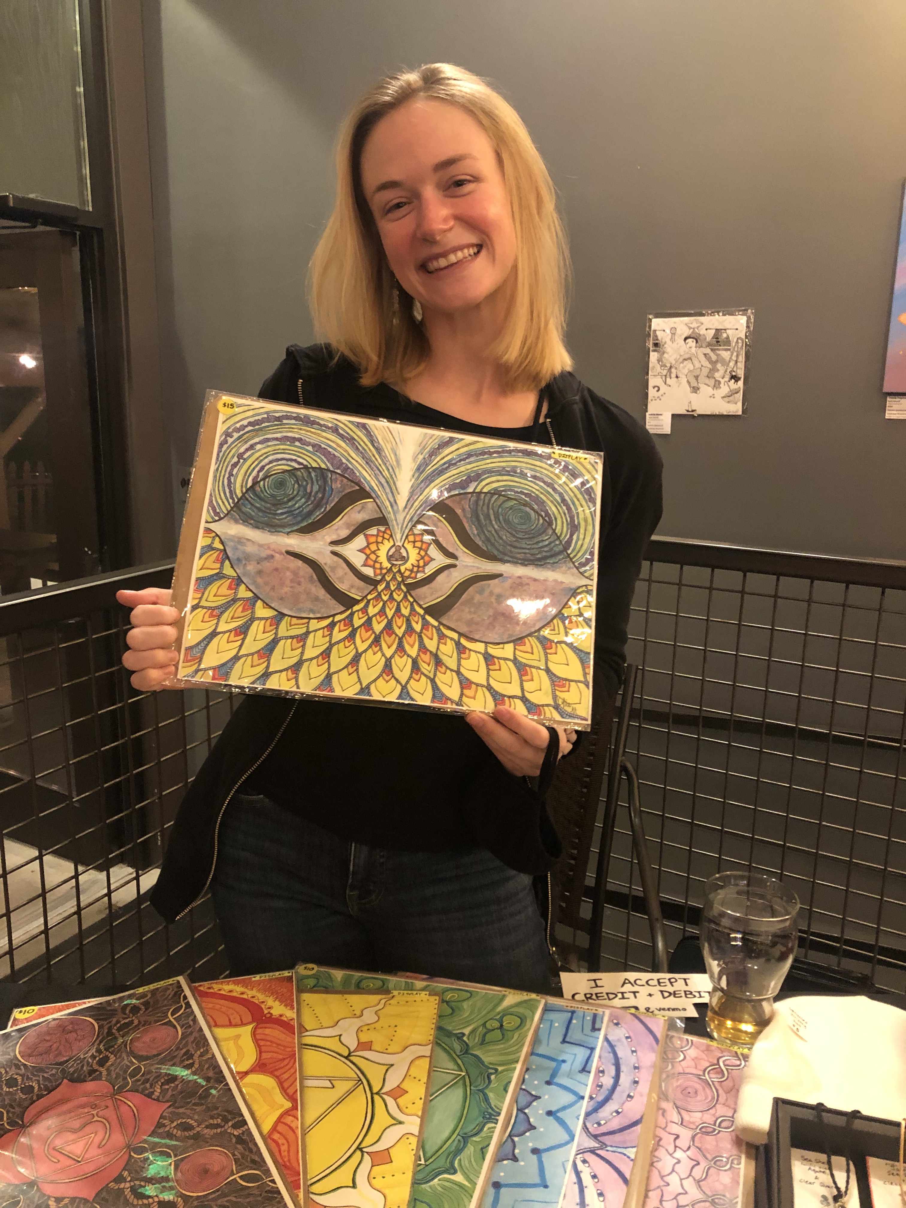 We felt the sound waves of good vibes all around the Art exhibits in West Seattle, thanks to the Muse Fest musicians and hosting businesses! What a special evening brought to us by the incredible efforts of local musician Sue Quigley and The Art of Music volunteer John Redenbaugh. Their labors of love meant a very rich Art Walk experience last night. Did you also catch the music at WEND Space, thanks to their partnership with the City of Seattle program Shop to the Beat? So much wonderful sound, in addition to all the varied and beautiful art from Admiral through to Morgan Junctions! Graced by the magical new twinkling lights on the trees lining California Avenue.