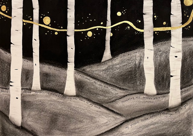 Katie Wilson is a West Seattle artist and writer whose work is inspired by Pacific Northwest nature, texture, and stories from her imagination. She strives to create pieces that tell stories and evoke curiosity, sometimes tucking small poems in the shadows. Her work explores a variety of media – charcoal, genuine gold and silver leaf, watercolors, acrylic, and scratchboard – but is tied together by a celebration of detail and shared feeling.
