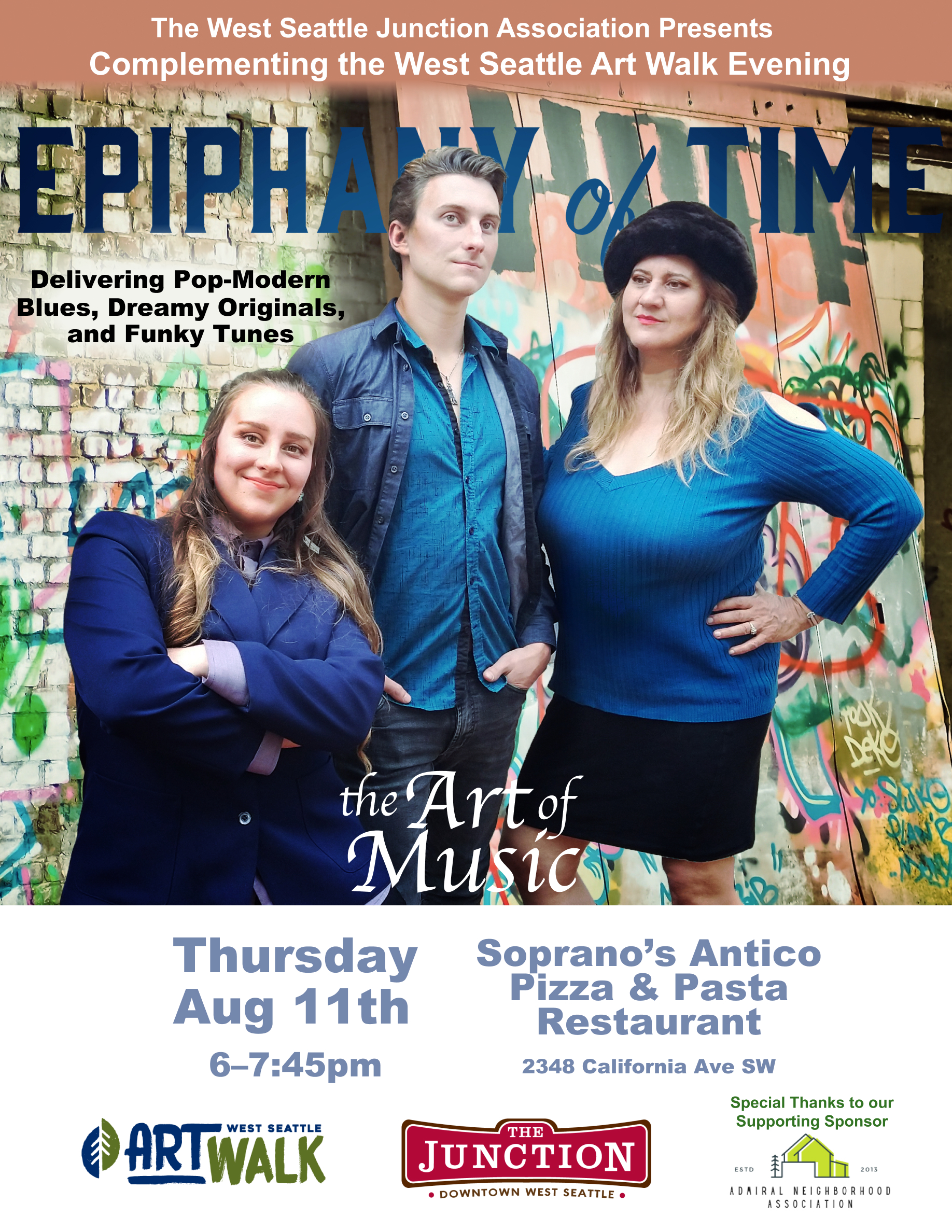 - August 11 – Epiphany of Time @ Antico Soprano’s Pizza & Pasta Restaurant Local West Seattle musicians bring you pop-modern blues, dreamy originals, and funky tunes. Come experience the brilliance of Epiphany of Time, achieved through a dedication to the art. Come ready to jive and dance with the band! Click here for Epiphany of Time’s flyer …and view a video of Epiphany of Time