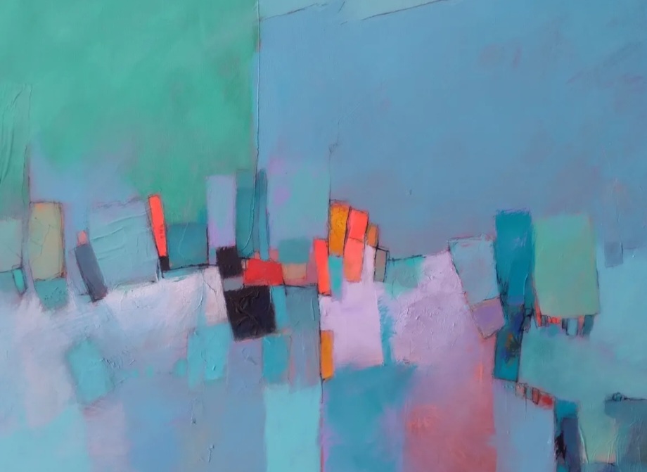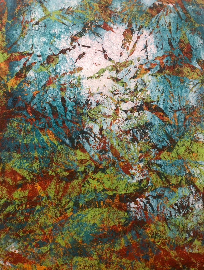 My recent works are intuitive abstract paintings that start with random marks and shapes. I have no preconceived idea about what I am going to paint. I add and remove marks and shapes to build up interesting layers and relationships. The process is then repeated multiple times to give the painting some history.