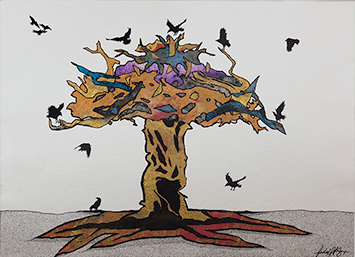I am mostly self-taught but early on benefitted from the mentoring of the late renowned Southwest artist Mel Casas, and from Peruvian artist, Francisco Grippa. I get my inspiration from my surroundings, both natural and man-made, photographs, music and from images in my dreams. This exhibit focuses on trees. Trees are such an endless source of inspiration for me. Trees speak to me in many ways. In them I see energy, love, sadness, and so much more. Their texture lends itself to detailed expression while their limbs can denote a range of moods and resurrect memories. As is my practice, I also include new pieces outside of the show’s main theme as a means of hinting at where my mind wonders and where that wondering might lead me creatively.