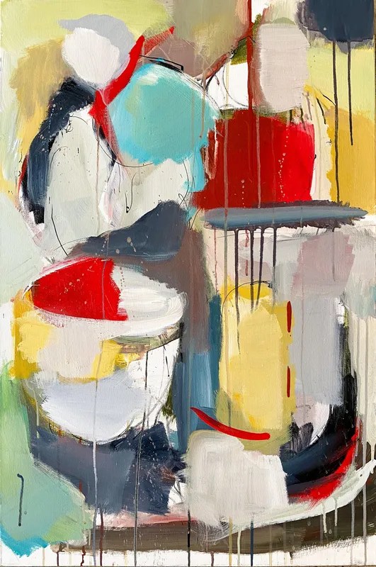 “My latest body of work explores the intentional disintegration and abstraction of a still life scene, eliciting a feeling of beginning a profound sense of nourishment and newness. The warm cradle of a burgeoning kaleidoscopic natural environment evokes calm but reminds the viewer of times rapidity and the constant annihilation cycle of the natural world. WE see the energy of the paint as moving object and hold onto it for a moment before the decay.” – Liz Moody
