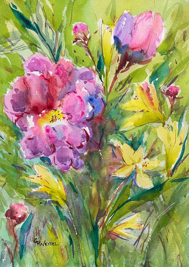 Glenda is a watercolor artist who has lived in West Seattle for over 20 years. She loves the immediacy and fluidity of watercolor, but has recently been exploring ways to free watercolor paintings from being framed behind glass. Several of the pieces in this show are done on archival tissue paper and mounted on a canvas and finished with varnish. This technique maintains the freshness of watercolor, yet sets it free from glass. She also enjoys using traditional watercolor paper and some of those are also in the show.