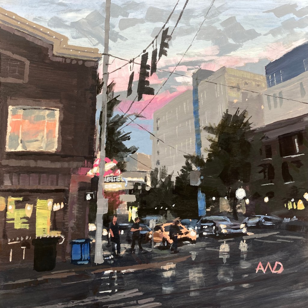 I love the neighborhood environs here in West Seattle, and value the relationships I’ve built with neighbors, merchants and other local artists. I’ve always been fascinated by cars and buildings, both as objects of design and as vessels for our collective history and memories. My paintings attempt to capture their souls and tell stories of the places they’ve held in our lives. I approach them with a playful sense of humor, and always strive to offset the subjects with compelling patterns and backgrounds. I think my years of architectural drafting find an echo in the detailed linework and graphic lettering in the paintings. Recently I’ve been experimenting in a more three-dimensional direction by doing shadowboxes combining paintings with vintage toys and other recycled objects.