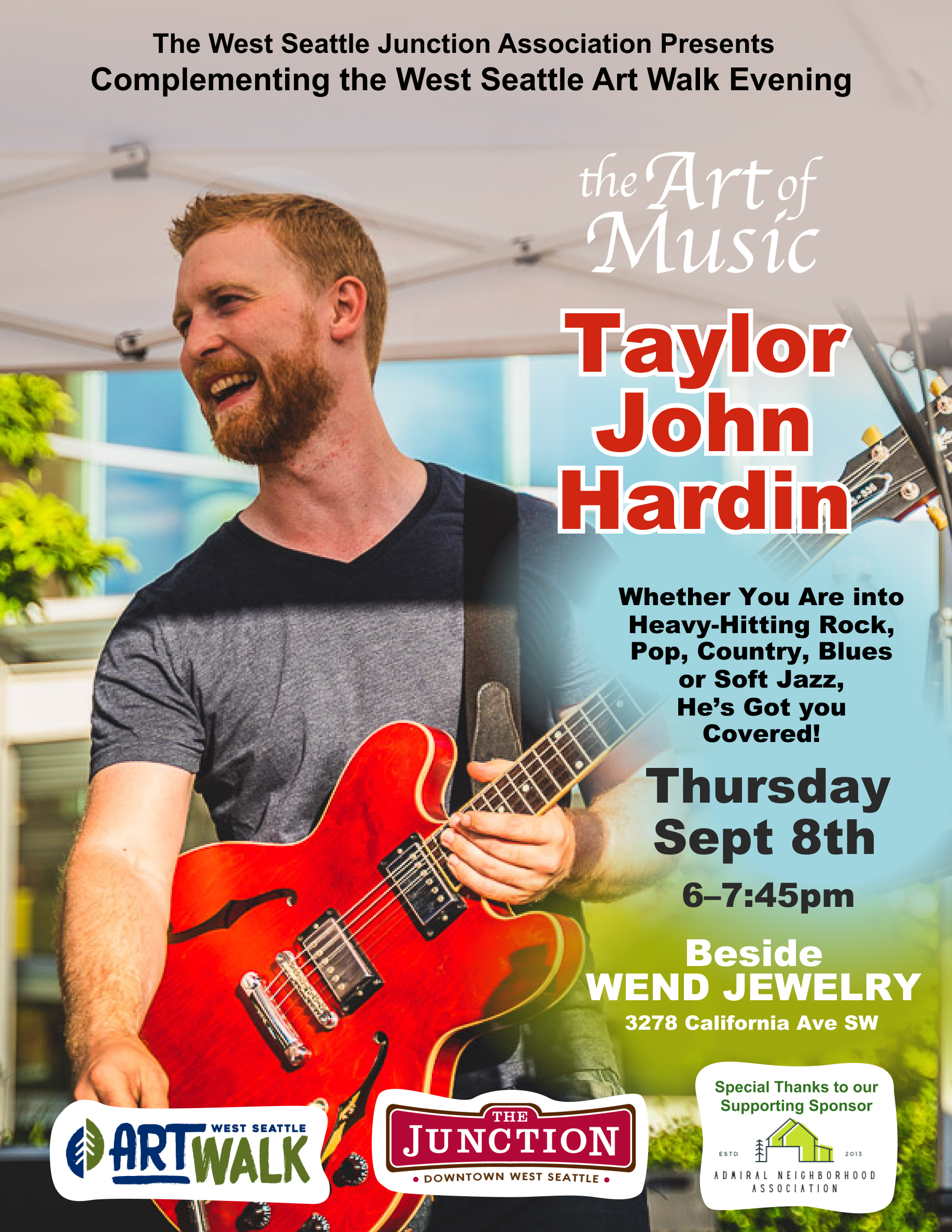In addition to the Sebastiano’s photography in our gallery, we are also hosting live music right outside our front door. Thanks to the support of the West Seattle Junction Association, Taylor John Hardin will be performing. Whether you’re into heavy hitting rock, pop, country, blues, or soft jazz, he’s got you covered. Taylor’s side gigs include Twitch Streamer, Music Teacher, Host of BandHouse Podcast, and tons of other music projects. Click here for Taylor John Hardin’s flyer. And check out this video of Taylor!
