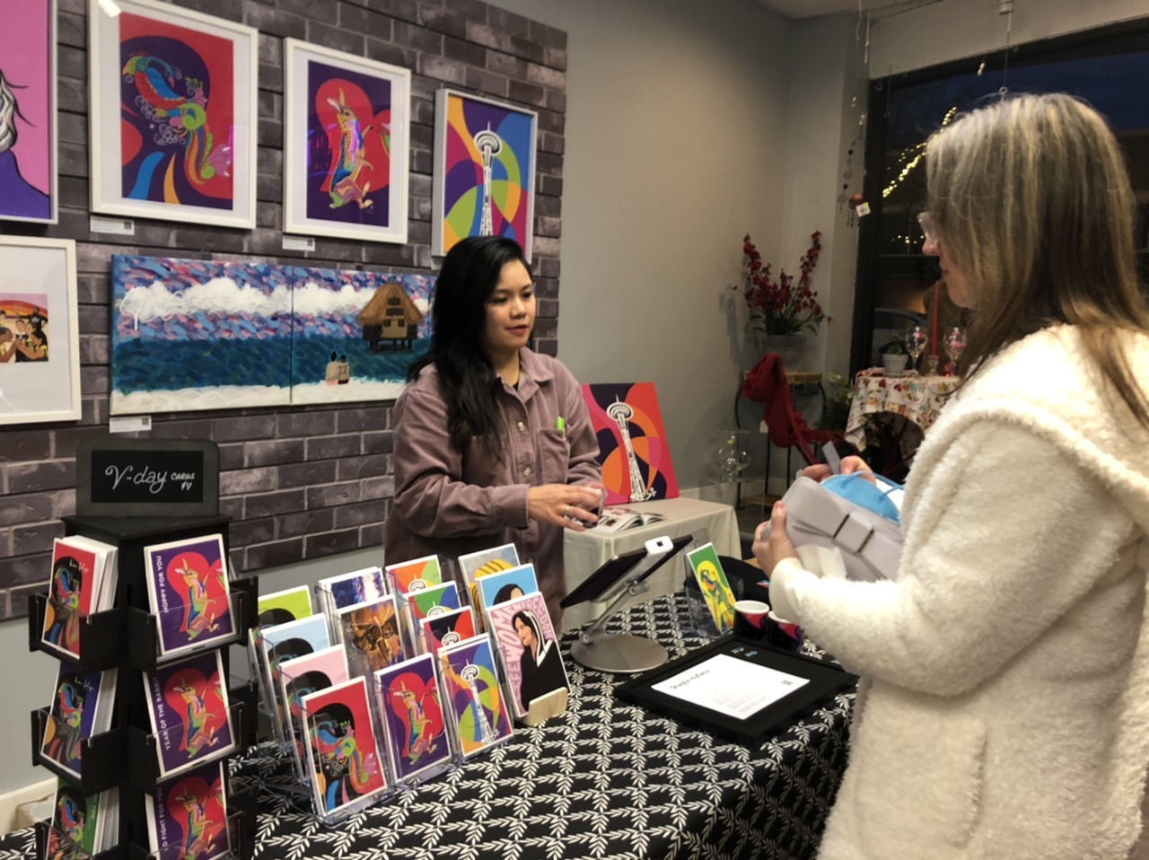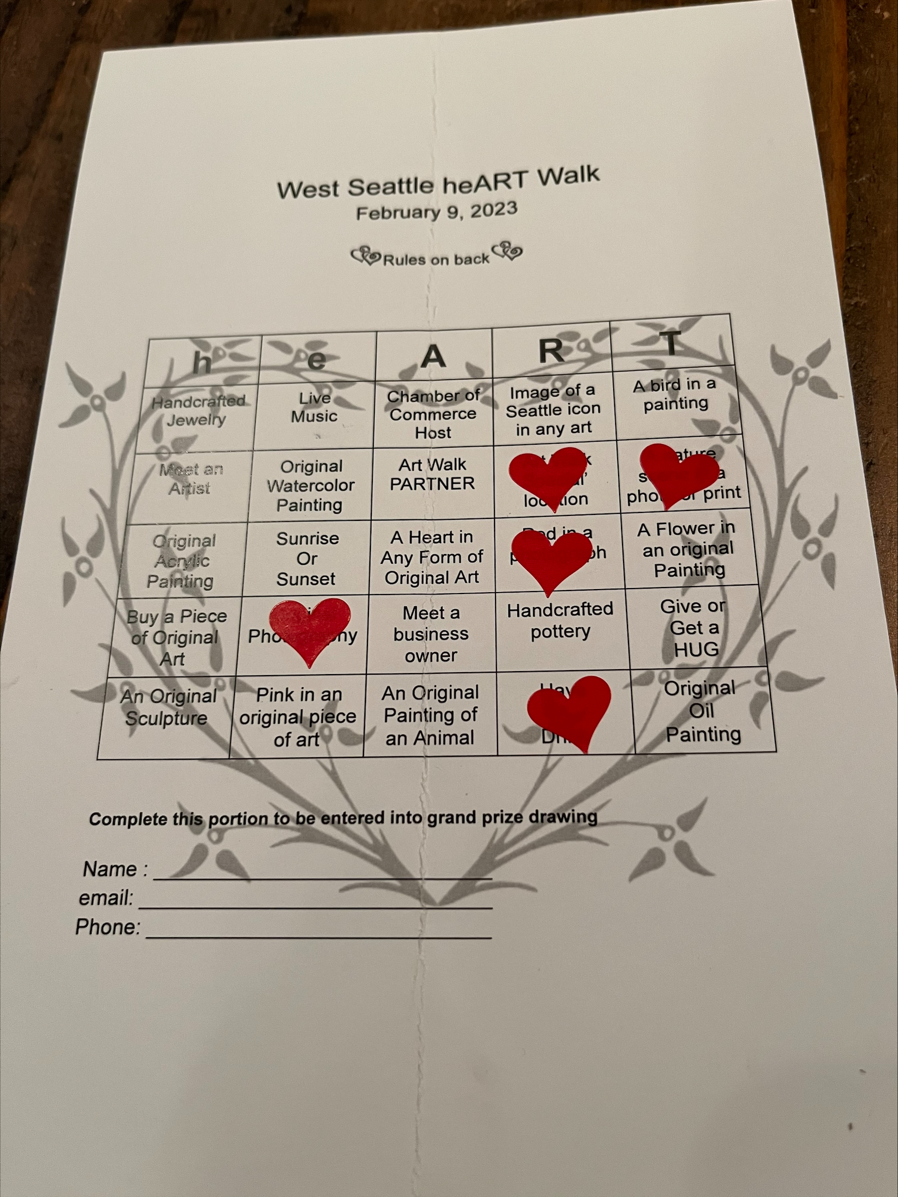 West Seattleites came out to share their love for February Art Walk’s special event – HeART Bingo. The WS Art Walkers picked up bingo cards at participating businesses and claimed stickers for each business visited. After visiting 5 or more venues, participants turned in their cards for a chance to be entered into a drawing for a specially curated Valentine’s Day Basket, with lovely items contributed by our art walk local businesses! Everyone had a great time!