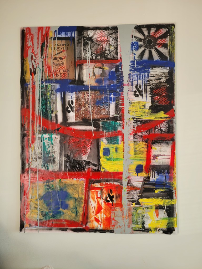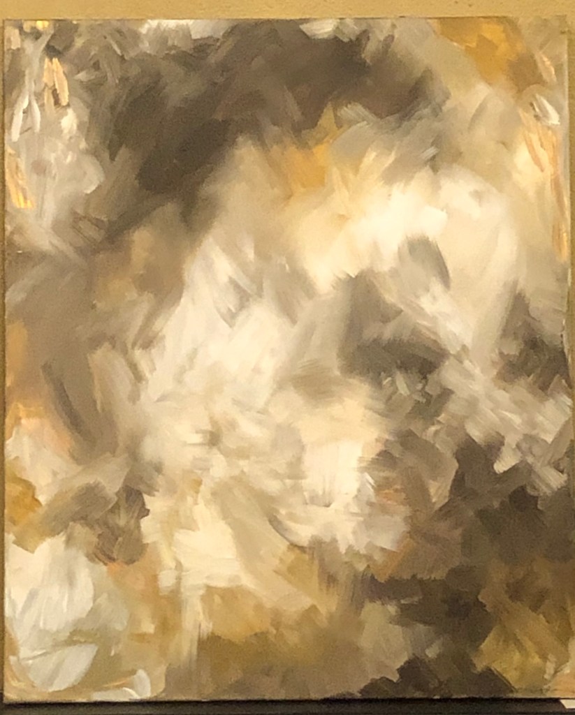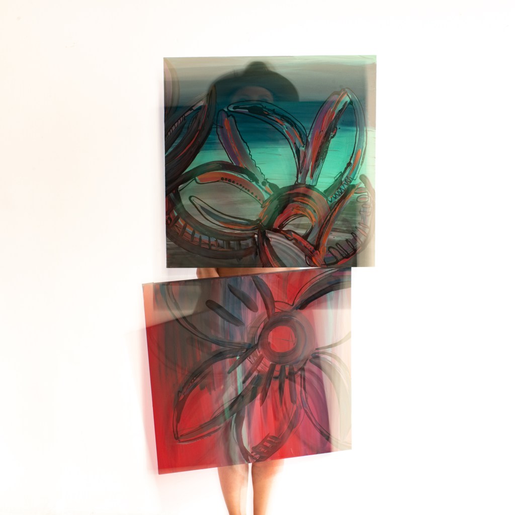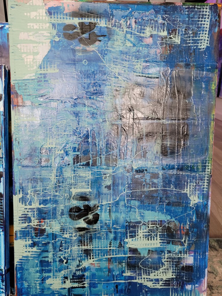 Cat Brooks, a fresh face in the art scene at 53 years old, is debuting her work as an abstract painter and digital artist here in West Seattle. Born and raised in New York, she didn’t pick up a paint brush until she was in her 40s as a therapeutic exercise after being diagnosed with Endometriosis. Her new series, primarily digital, reflects the journey of a woman living many years in pain with an invisible disease. Using a darker palette and leaving the figures faceless is reflective of feeling unseen and dismissed. Subjects are skewed, a little contorted, or fading into the background, yearning to reclaim visibility and agency.