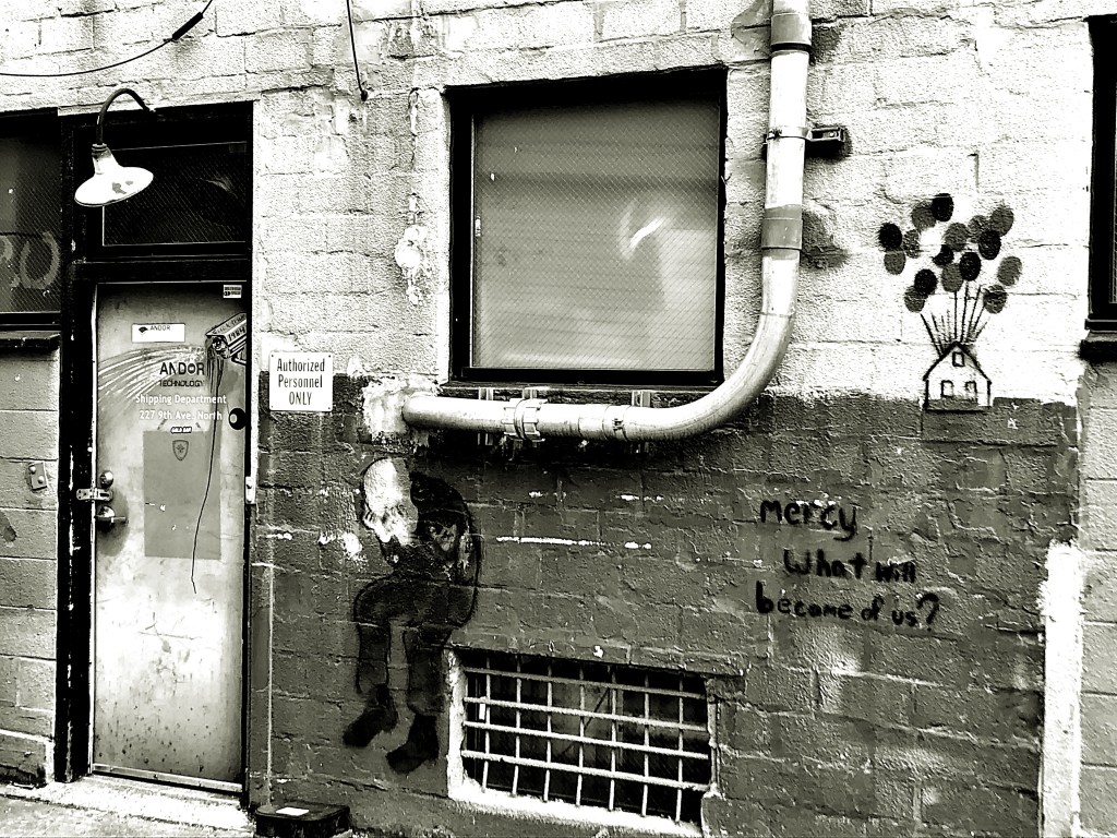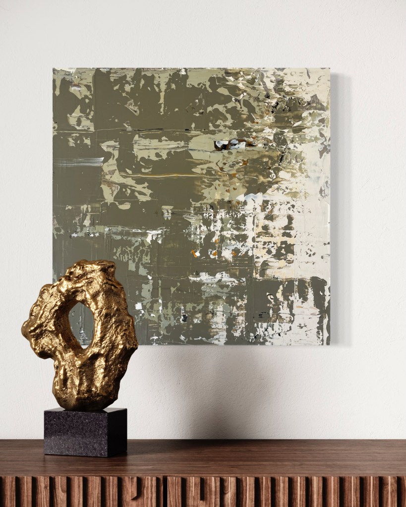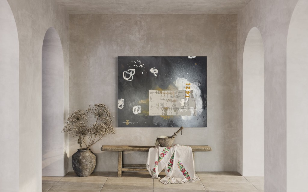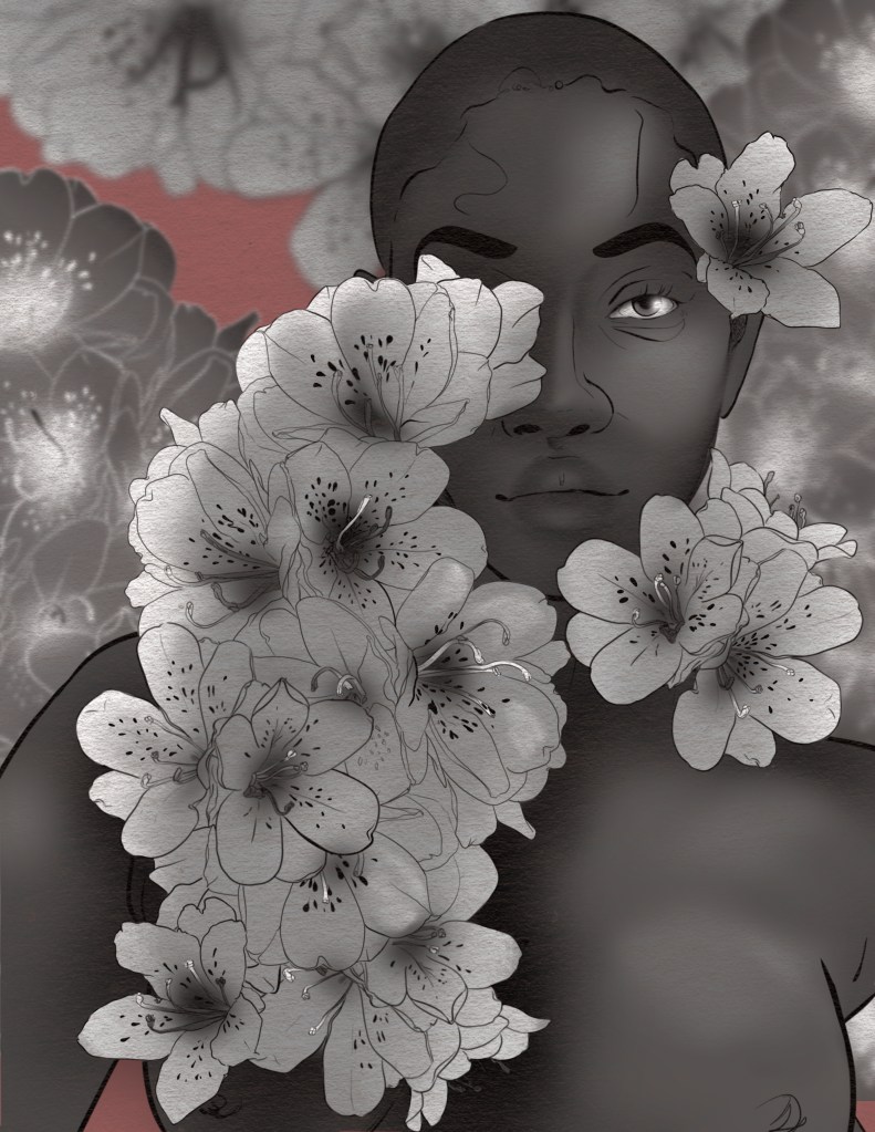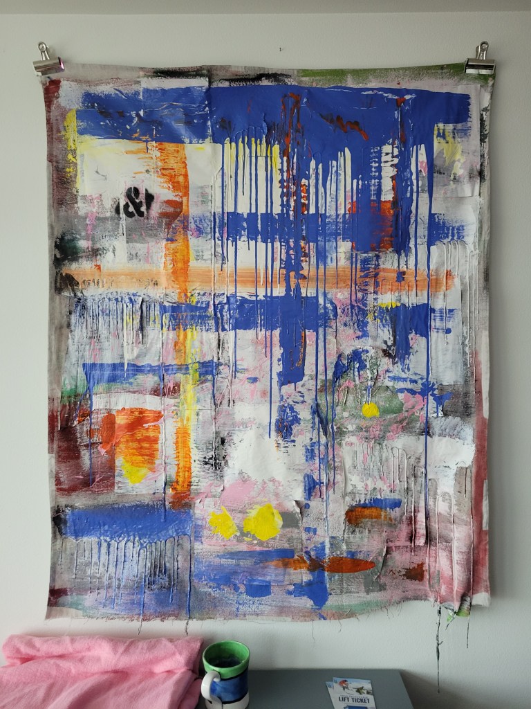 Cat Brooks, a fresh face in the art scene at 53 years old, is debuting her work as an abstract painter and digital artist here in West Seattle. Born and raised in New York, she didn’t pick up a paint brush until she was in her 40s as a therapeutic exercise after being diagnosed with Endometriosis. Her new series, primarily digital, reflects the journey of a woman living many years in pain with an invisible disease. Using a darker palette and leaving the figures faceless is reflective of feeling unseen and dismissed. Subjects are skewed, a little contorted, or fading into the background, yearning to reclaim visibility and agency.