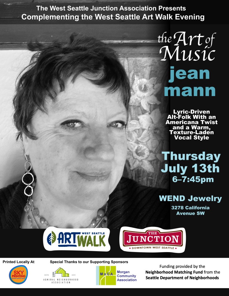 The upcoming July 13 West Seattle Art Walk will feature Art of Music with events in the Admiral District and Alaska Junction! Please see posts for Alki Arts Pop-up Gallery and WEND Jewelry for information on musicians playing this month.