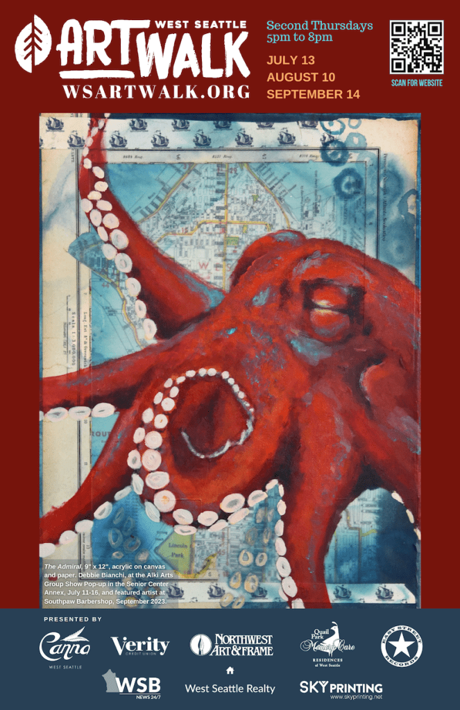 If selected, your artwork will be featured in our social media, on printed posters displayed around West Seattle in participating businesses, and on walking maps available at participating businesses. We also strive to have the featured artist show their art all three months at businesses around West Seattle. This is a great opportunity to have your work displayed and promoted in our community, like “Admiral,” by Debbie Bianchi in Q3!
