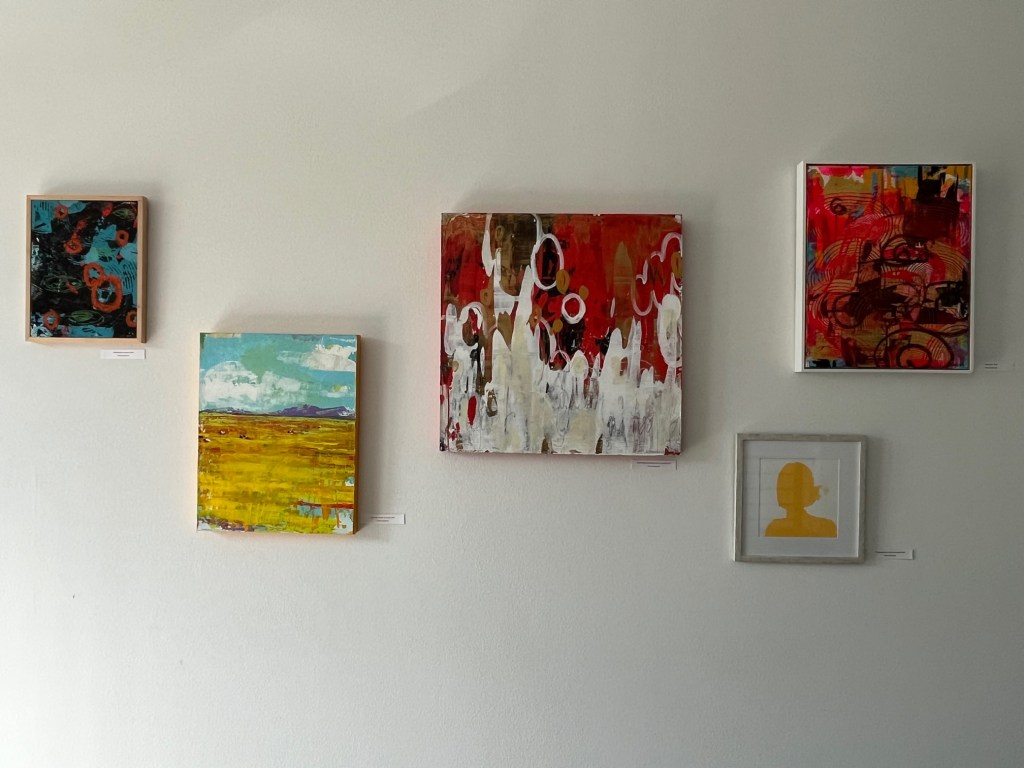 Cat Brooks, a fresh face in the art scene at 53 years old, is debuting her work as an abstract painter and digital artist here in West Seattle. Born and raised in New York, she didn’t pick up a paint brush until she was in her 40s as a therapeutic exercise after being diagnosed with Endometriosis. Her new series, primarily digital, reflects the journey of a woman living many years in pain with an invisible disease. Using a darker palette and leaving the figures faceless is reflective of feeling unseen and dismissed. Subjects are skewed, a little contorted, or fading into the background, yearning to reclaim visibility and agency.