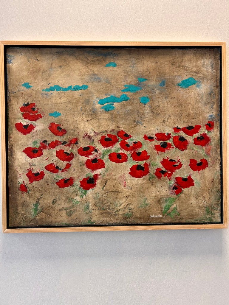 Deb McCarroll’s bold work embodies the Northwest’s regional culture. Patterns are created with Seattle’s ubiquitous falling rain. Paper is integrated into wet paint and then set on fire. Metal leaf is frequently woven into scenes and selectively oxidized with acid to add patinas in glittering greens and browns. Local flora and fauna are painted in startling realism and then pared with raw abstract practices.