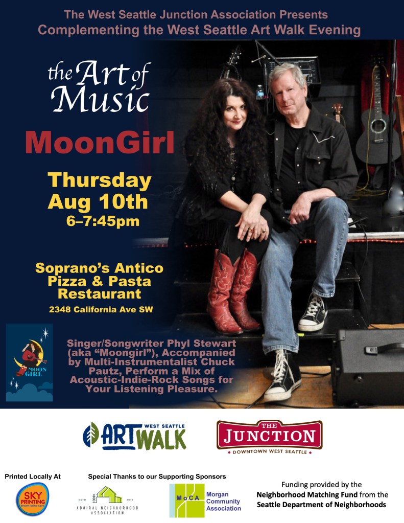 This month Soprano’s is pleased to host the performer MoonGirl . Singer/songwriter Phyl Stewart, aka “Moongirl”, will be accompanied by multi-instrumentalist Chuck Pautz on guitar, ukulele, and harmonica to perform a mix of acoustic-indie-rock songs for your listening pleasure. Phyl and Chuck have performed as a duo, and with their band, “MoonGirl”(www.moongirlmusic.com), for over 10 years at numerous festivals, small venues, and events in and around Seattle. Their set will include original tunes and thoughtful arrangements of songs by artists they admire.