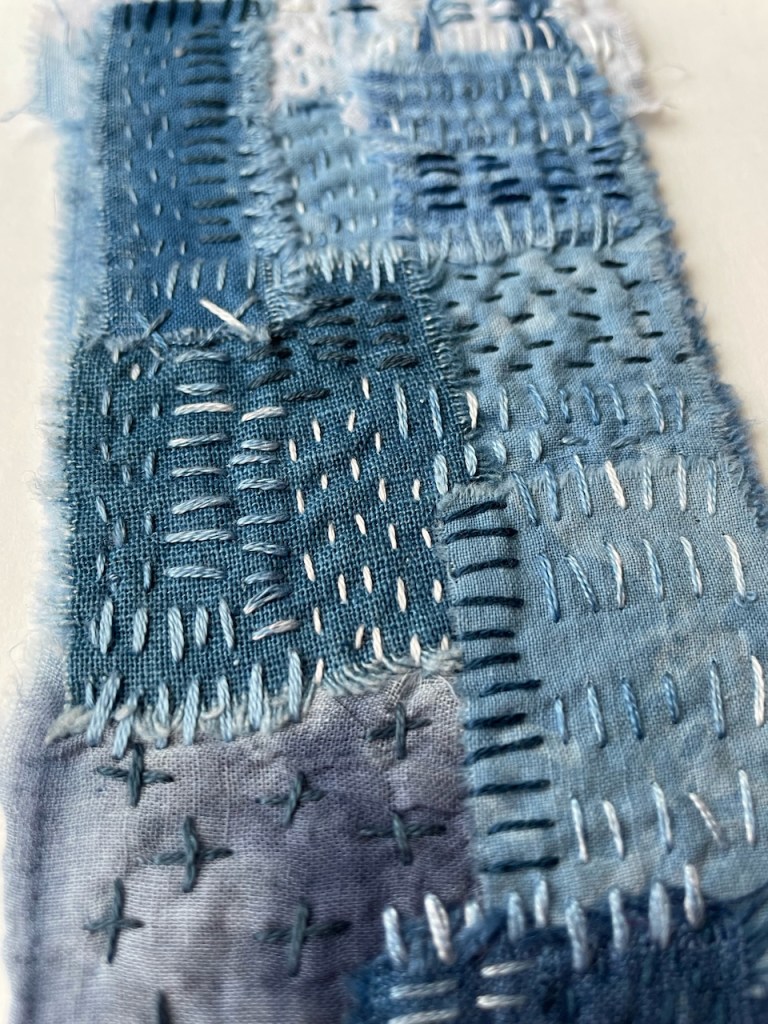 Shelly Sazama is an everyday maker, learner, and encourager. She loves creativity and constantly challenges herself to better her artistic practice. In her childhood, she would often blissfully get lost in making art. While choosing a career as a healthcare provider, she is still a daily maker. She loves the feel of and the stories contained in the vintage fabrics and linens. Shelly adds to the story by piecing and slow stitching them together. Inspiration for her slow stitching is often influenced by the wear or imperfect beauty of a fabric.