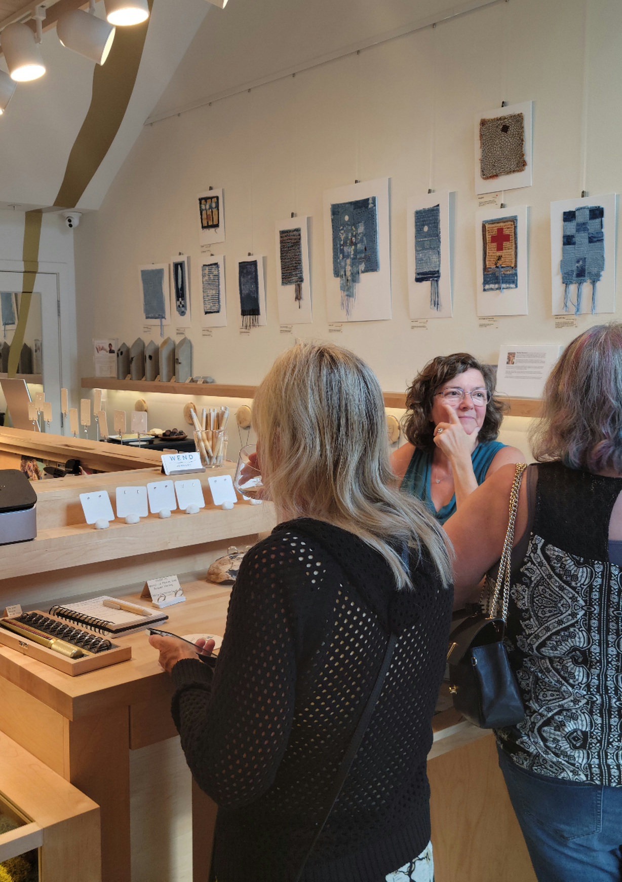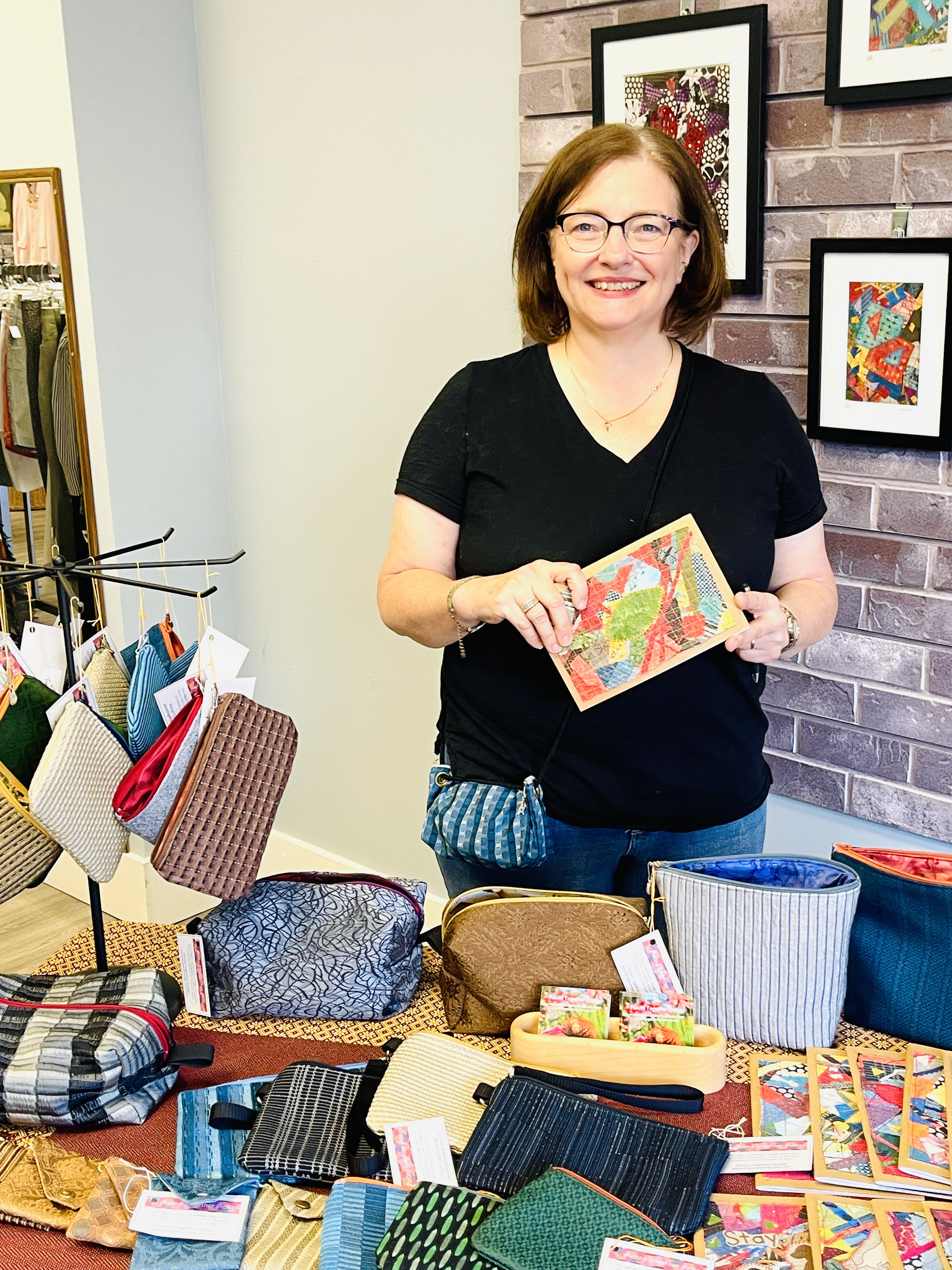 In the Admiral neighborhood, there was tons of action outside West Seattle Grounds, with artist Benjamin Jordan, as well as musical artist, Steve Theile. At West Seattle Realty artist Woods Bramble showed interesting paintings, including one of the Starbucks building. At Zelda Zonk artist Suzanne M. Uschold showcased her unique art, made with quilting techniques. Wend was abuzz with people making their way to the Admiral end of Art Walk from the Alaska Junction. Shelly Sazama’s beautiful textile pieces captivated viewers and happy buyers. At Molly’s Bottle Shop, Cat Brooks hosted not only her first show at Art Walk but the first time her artwork has been on display anywhere. A painter for several years, her personal narrative of battling Endometriosis and the art it inspires was a standout.