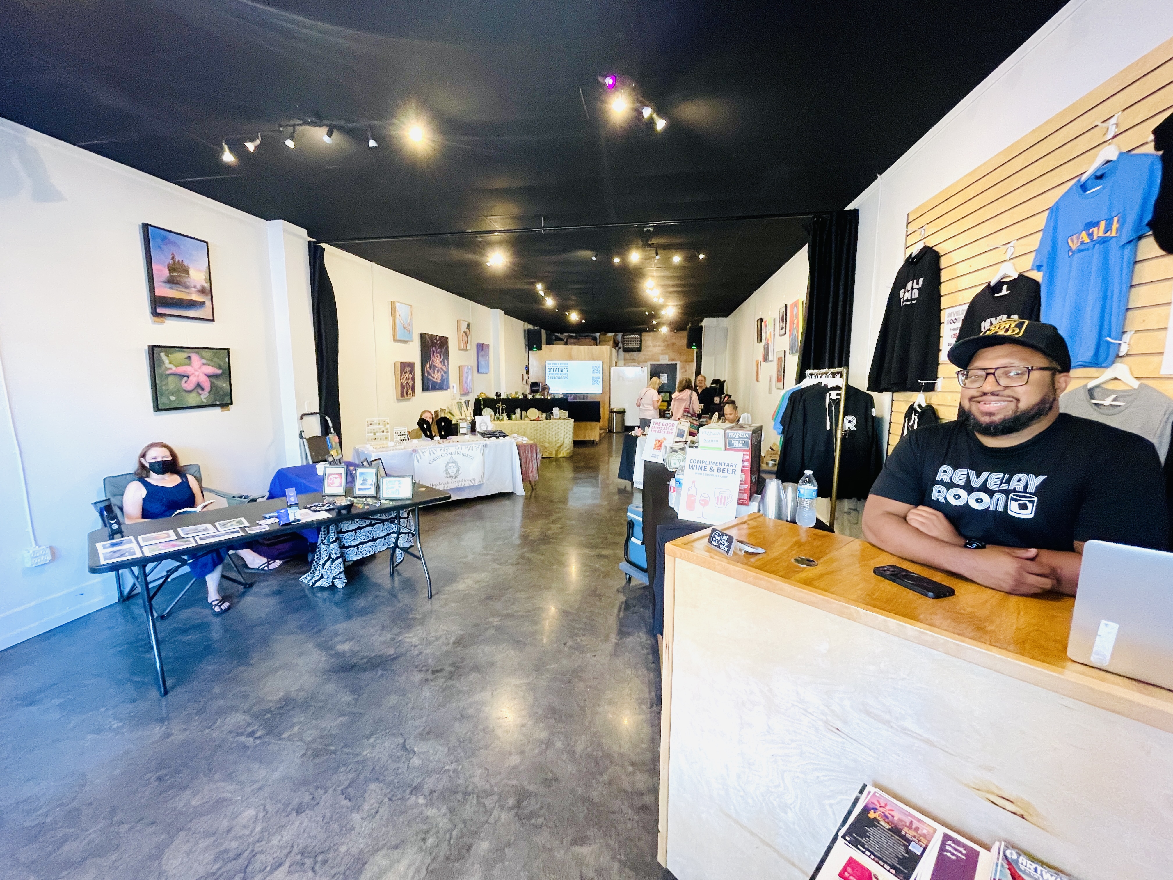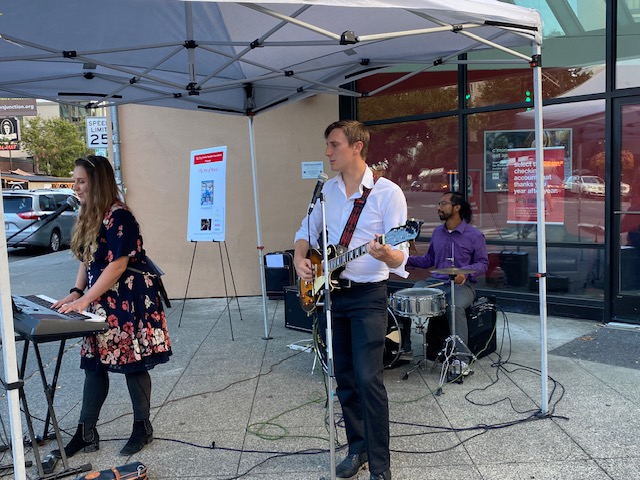 In Alaska Junction, Windermere was as always, a well-attended favorite due to brokers’ super friendliness and yummy snacks. The office was crowded with people really studying the art. At Discovery Shop people were very interested in both the art and the merchandise. Artist Betty Laughlin’s functional items were particularly popular. At Swan Dive vintage shoppers mixed with John Atkins fans to discuss his style, work, and signature looks. Lars Gesing gallery provided an immersive experience of nature as the artist delightfully unveils new breathtaking landscapes. At Jet City Labs there was a perfect mix of fine tunes, a friendly crowd, and a welcoming vibe for onlookers to enjoy. And for an uplifting boost to the evening, Epiphany of Time performed in front of KeyBank in the Alaska Junction beside the All-Ways Walk Intersection.