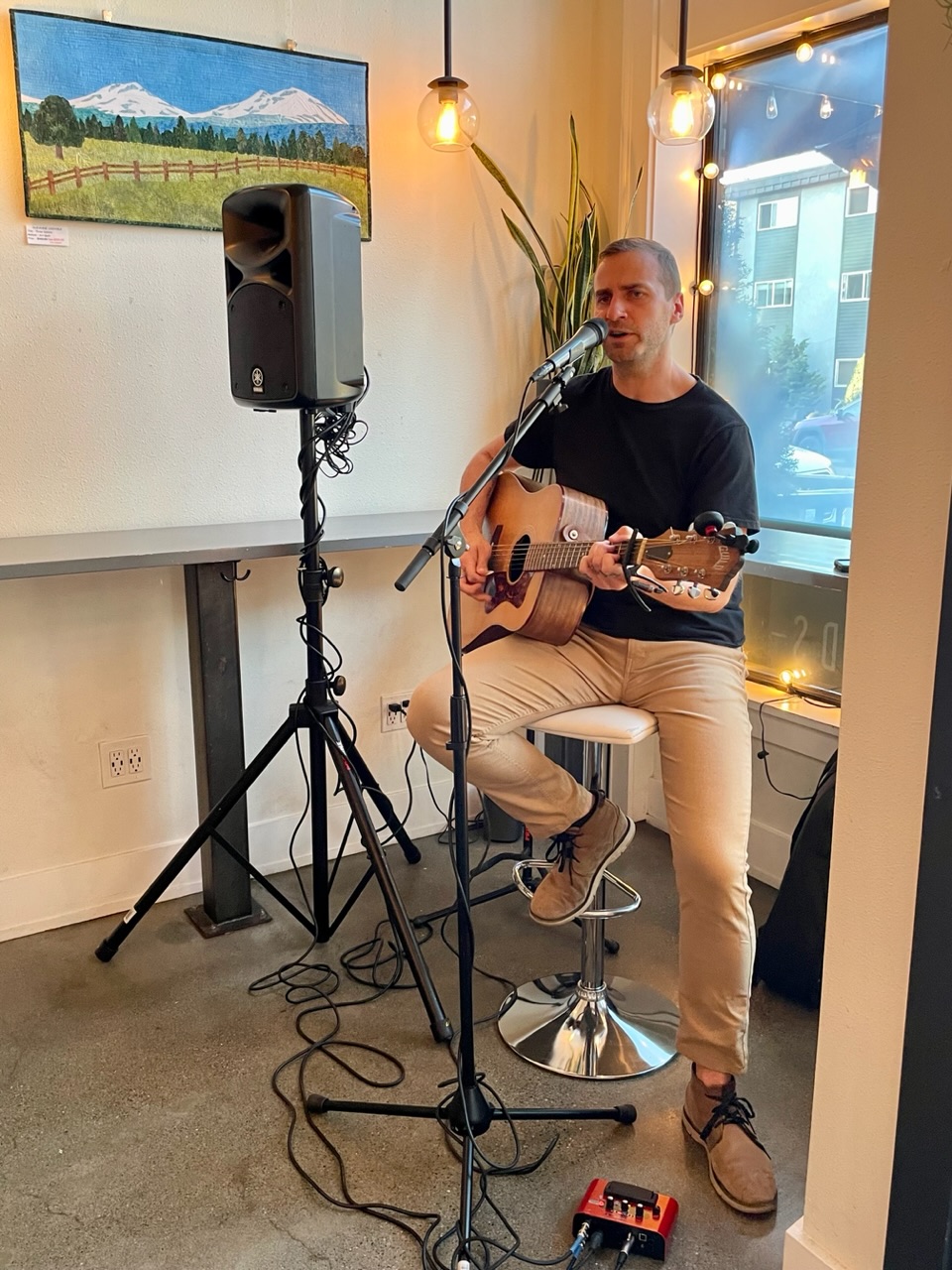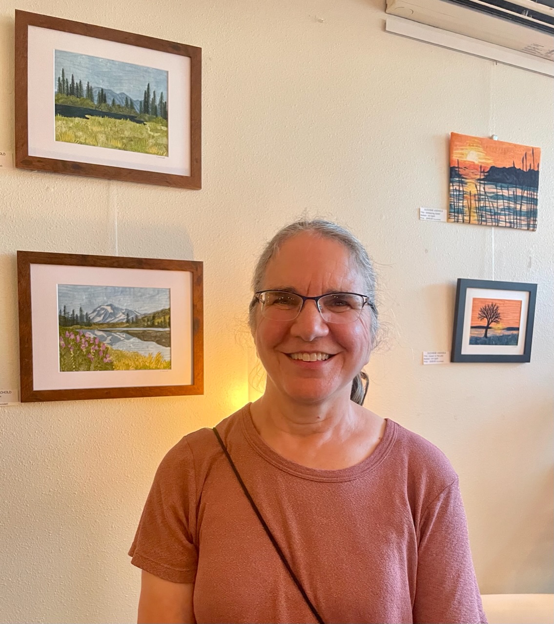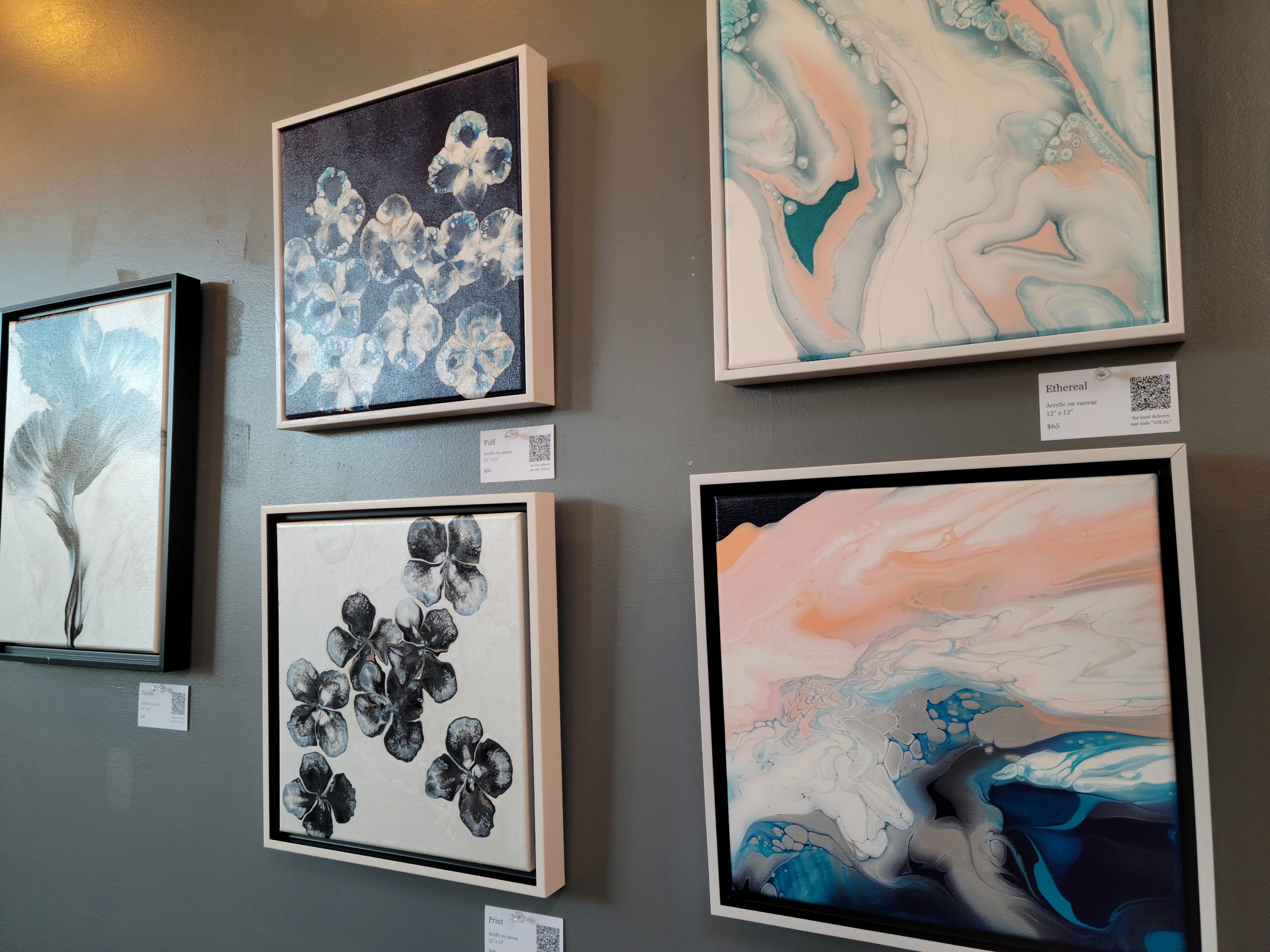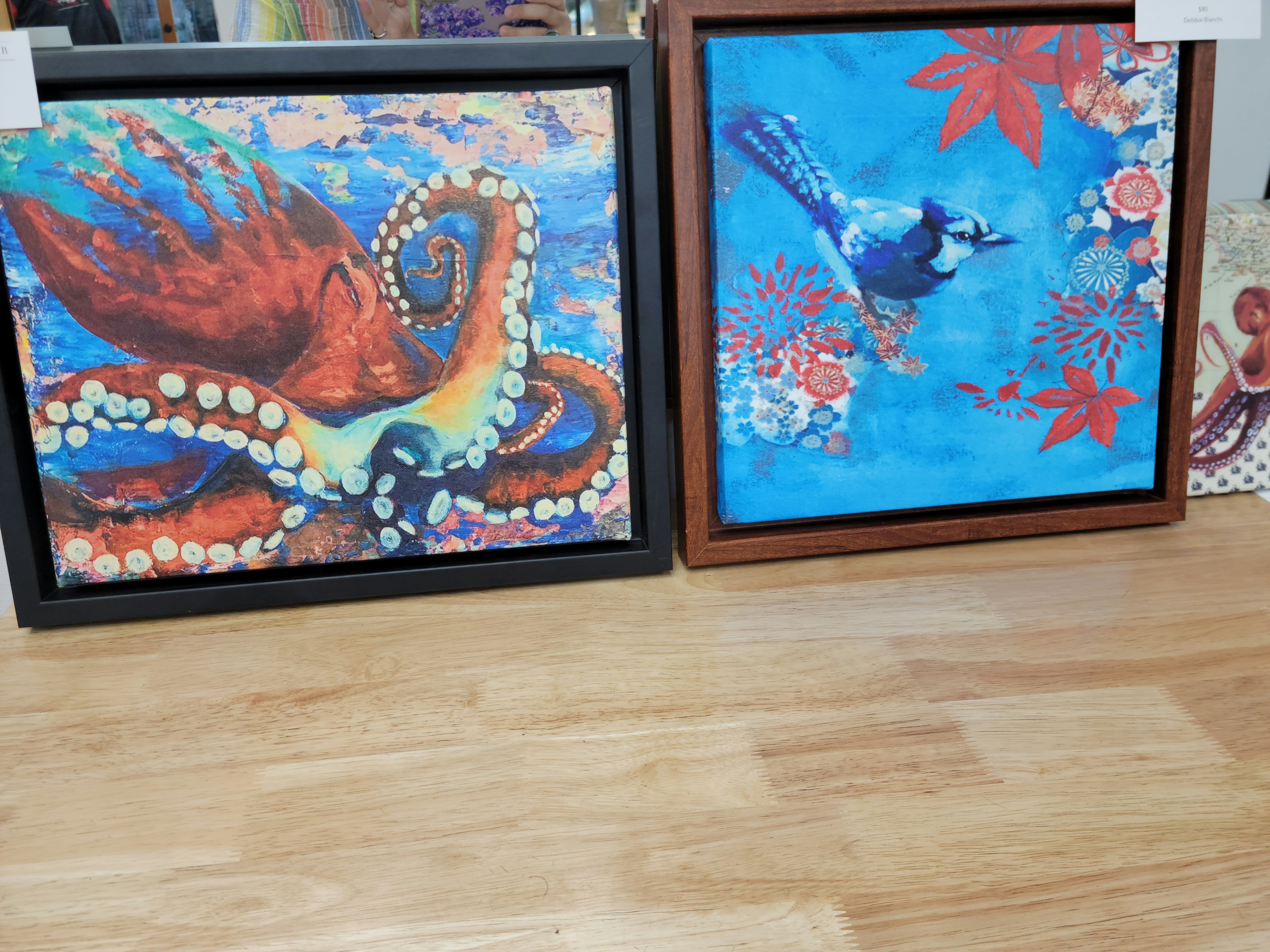 Up in Admiral, warm weather brought the crowd to Good Society Brewery for first-time Art Walk artist Jessica Tulloch’s show. The late summer sun and a nice breeze paired perfectly with her organic acrylic pours. Trevor Ras performed to a nice crowd at Welcome Road Winery. The winery was booked with seating outdoor seating reservations. At Wend, Carolyn Autenrieth captured the beauty of Alki’s trees against a seascape backdrop. A West Seattle resident, Carolyn was fascinated by their forms and shapes during walks along the beach and those in attendance seemed equally enthralled by the work. Our featured artist this quarter, Debbie Bianchi, brought a wonderful collection of prints to Southpaw Barbershop this month. Among her favorites were works featuring our feathered friends and backyard visitors, the Jay, and a pair of Nuthatches.