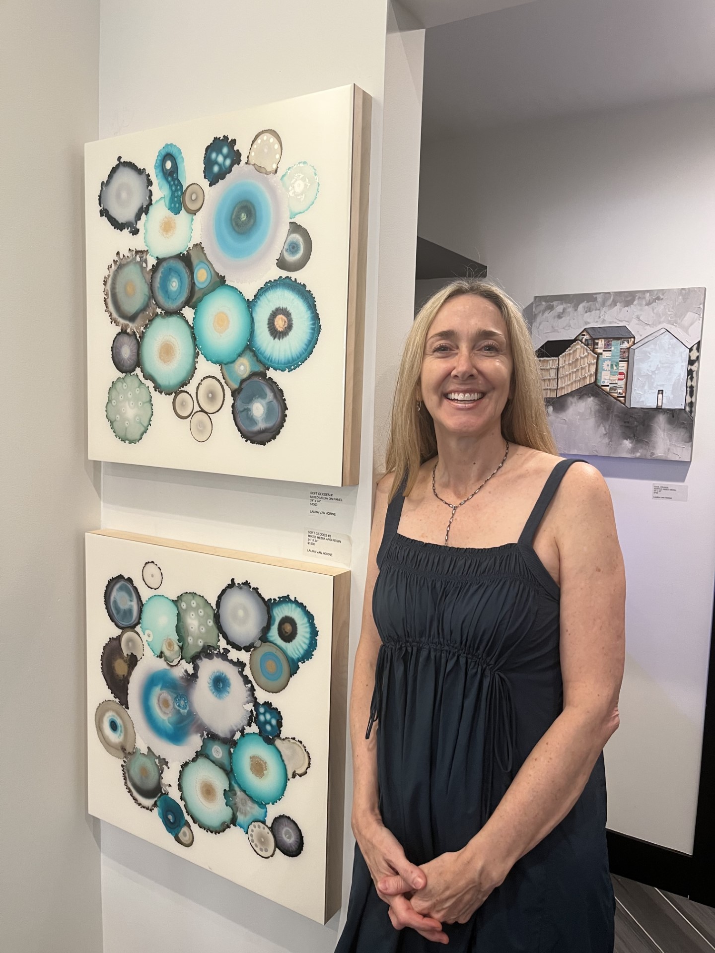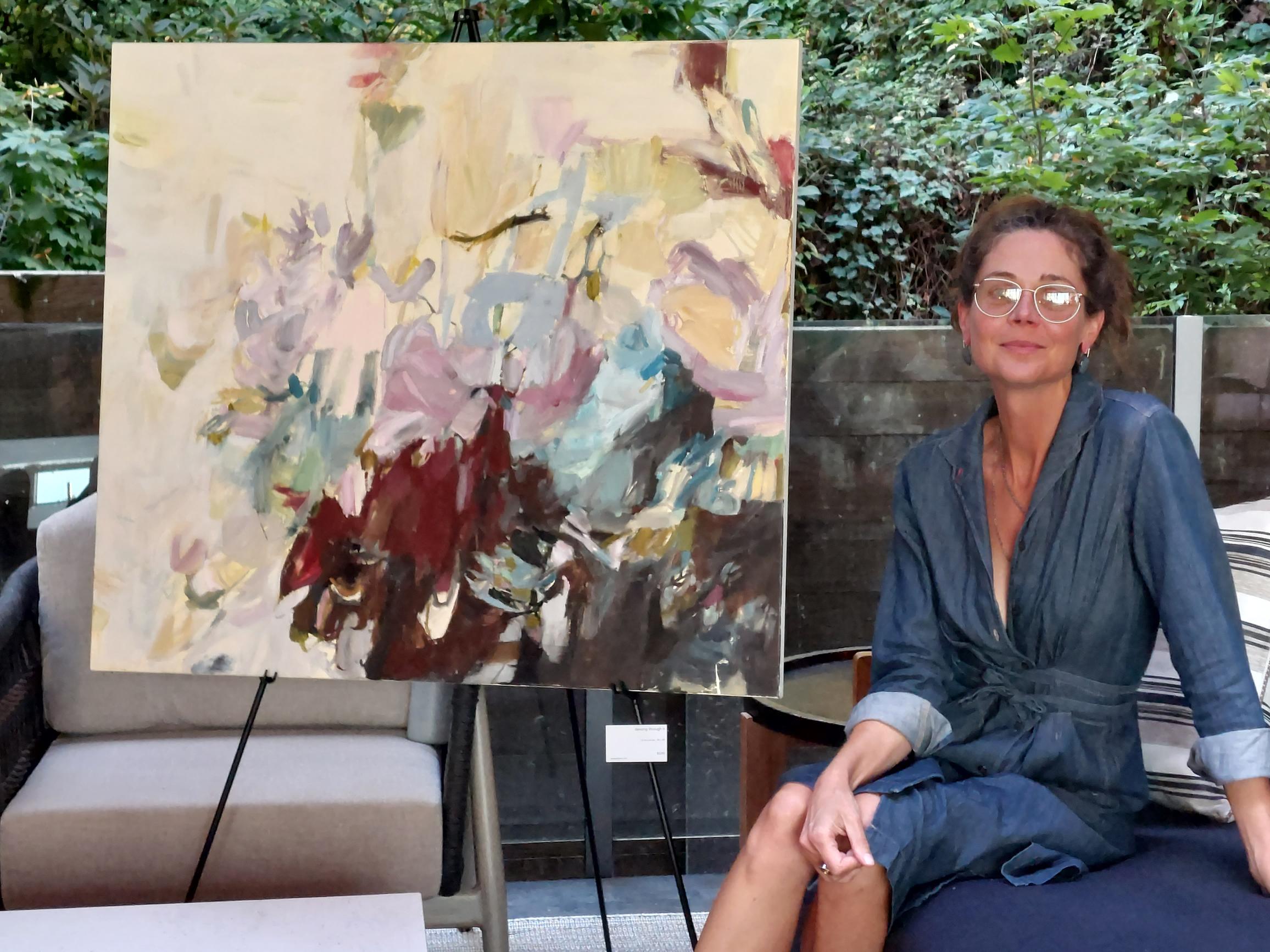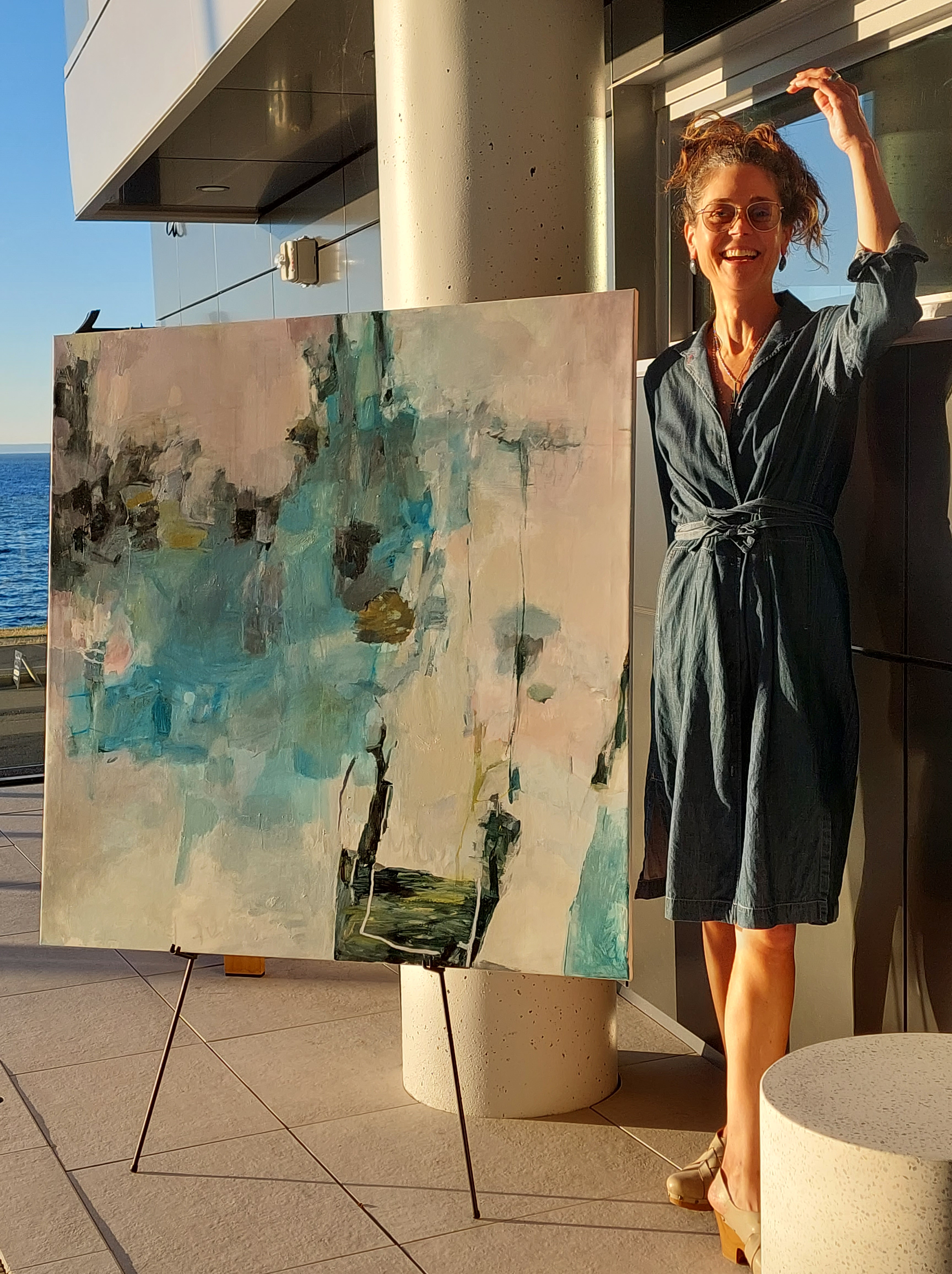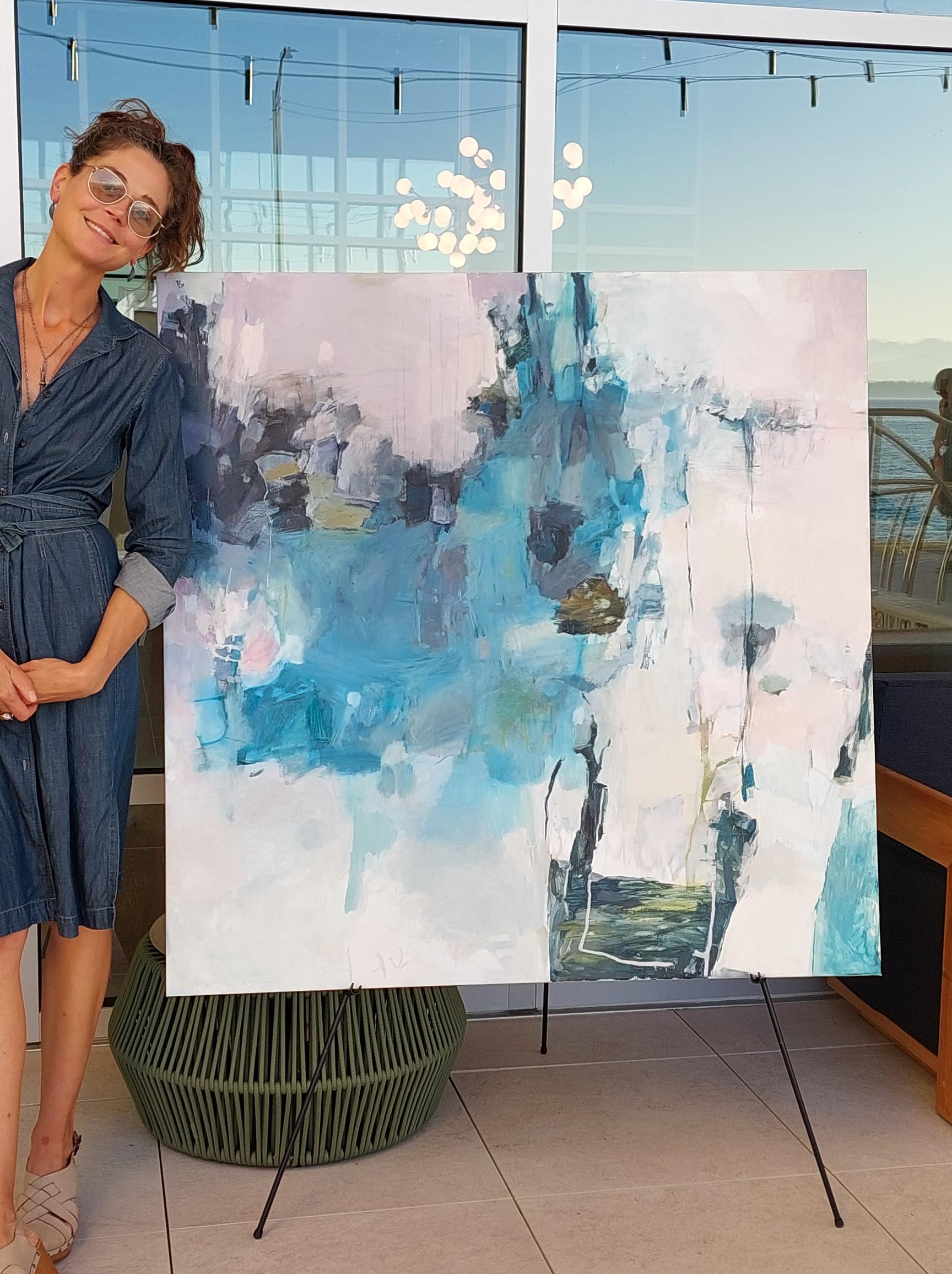Further afield, The Infinity Shore Club hosted Kate (Flückinger) Petty in the airy lobby, opening to a pool with a view of the Sound in front and in back, a garden with towering foliage. Inside was elegant, with Kate’s paintings on easels calling the sea and garden inside.
