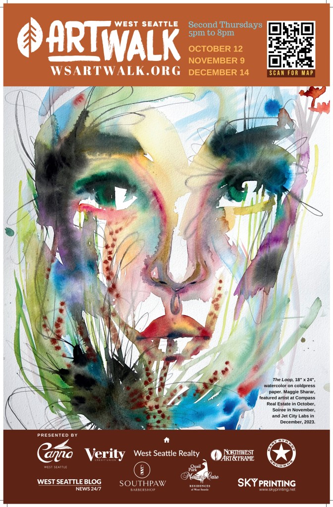 If selected, your artwork will be featured in our social media, on printed posters displayed around West Seattle in participating businesses, and on walking maps available at participating businesses. We also strive to have the featured artist show their art all three months at businesses around West Seattle. This is a great opportunity to have your work displayed and promoted in our community, like “The Loop,” by Maggie Sharar in Q4!