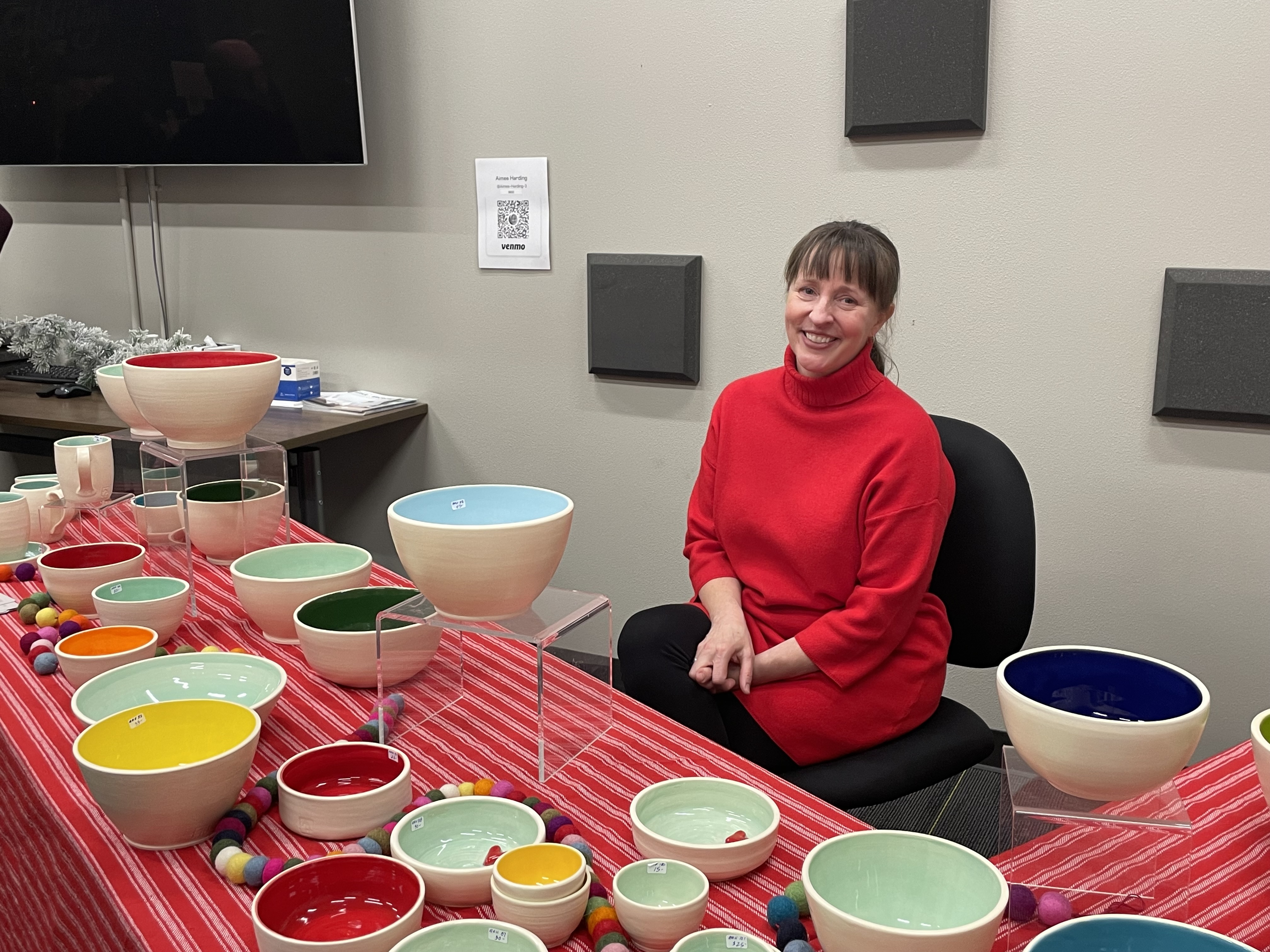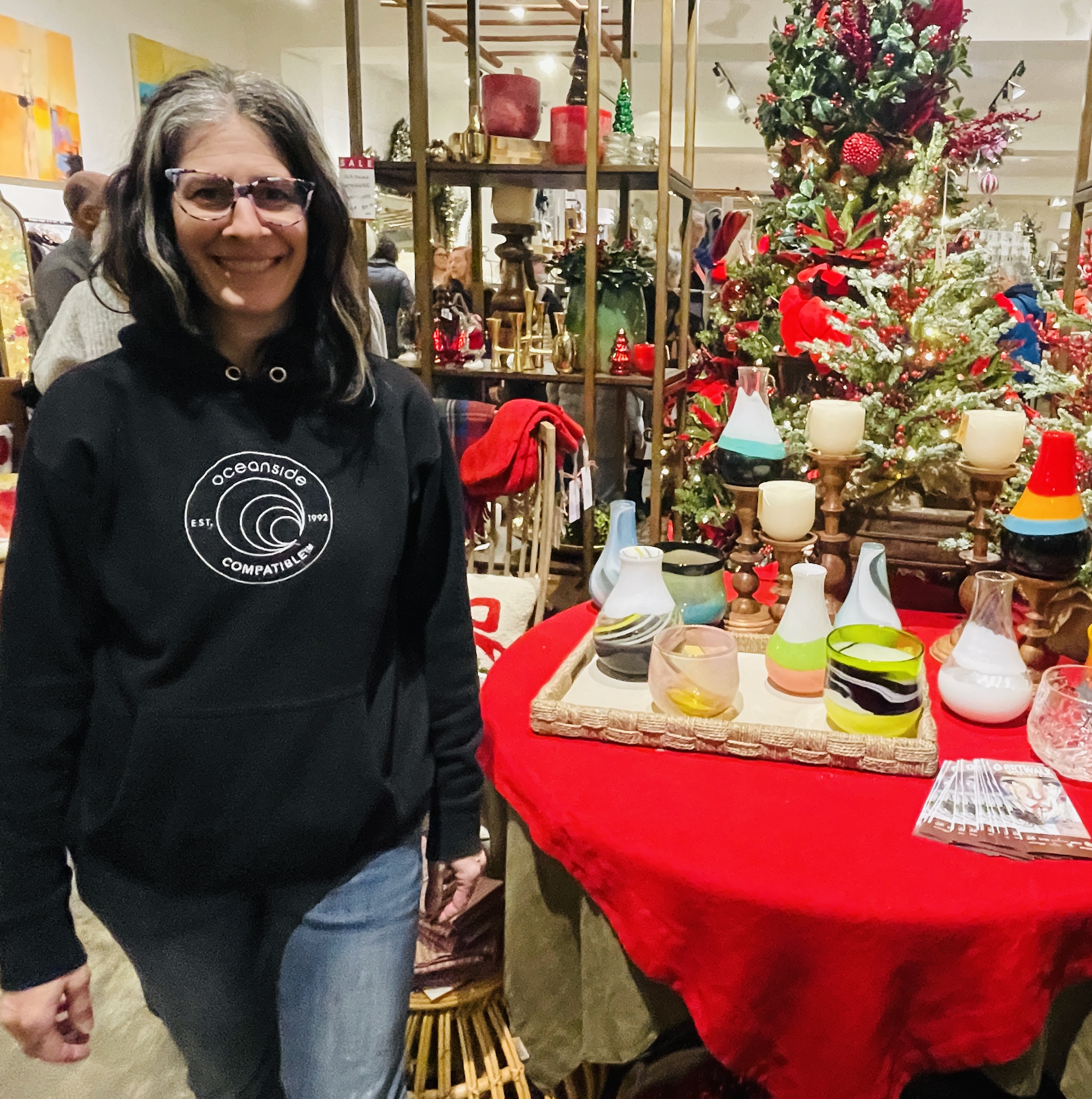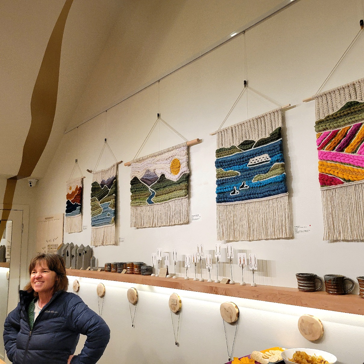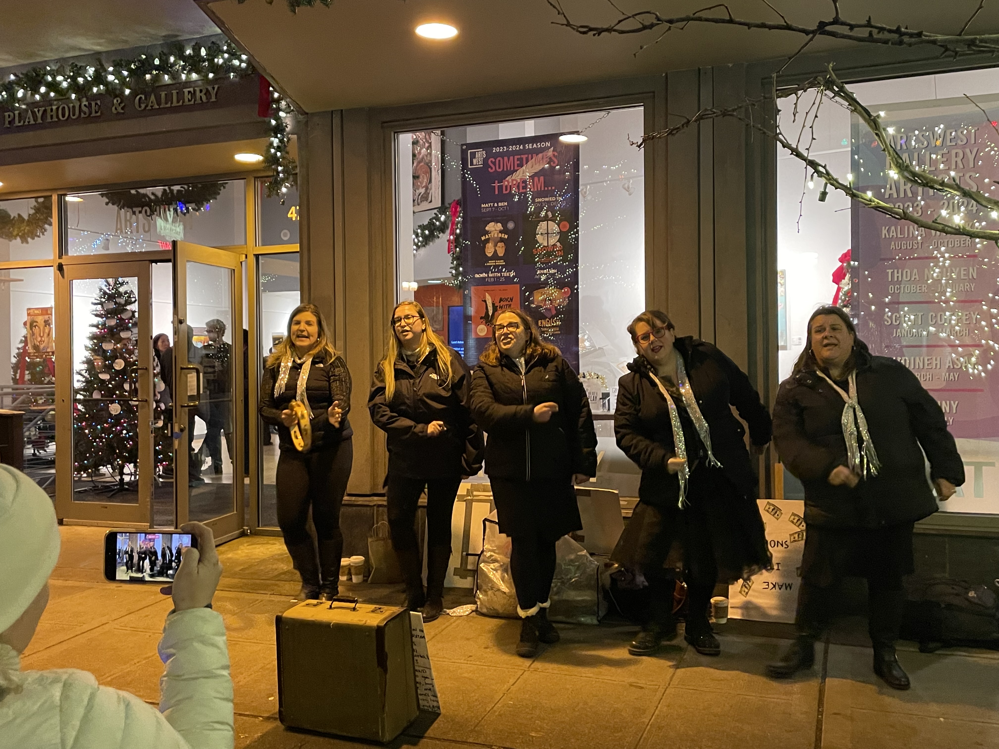 Further up California in Alaska Junction, The Holiday Art Walk was a spirited scene! The Silver Belles were singing merry melodies on the streets. The Better As Brass band, decked in golden finery, drew a crowd and raised spirits. Santa Claus strolled and posed for photos, always in fine fettle. ArtsWest held a lively artist’s reception with Thoa Nguyen’s show Common Thread.